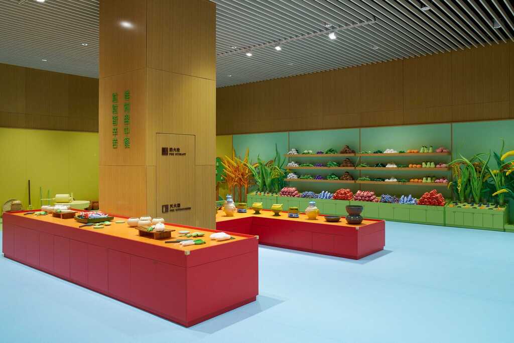 ◭具身体验-庖厨区,孩子们可以从食材架上灵活取用不同食材,在庖厨区通过秦汉炊具进行模拟化烹饪体验。