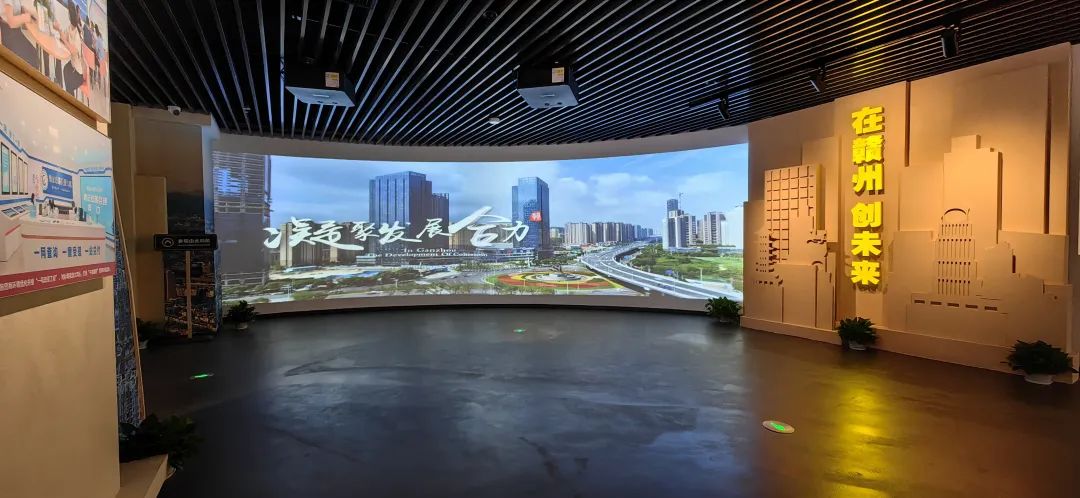 序厅处在客家建筑柱梁形成的中心框架中,运用新颖的立体画卷形式打造整体赣州的山水林泉,古迹城区,整体展览在此徐徐展开,两侧运用影像手段打造中国式的山水画卷,配合顶部云形态的吊装天花,充分体现山水融合赣州的美丽风光。两侧影像分别展示赣州历史沿革和21个区县市的发展历程及主要产业介绍,展示着赣州从古至今的自然与人文景观,展演赣州古今面貌。