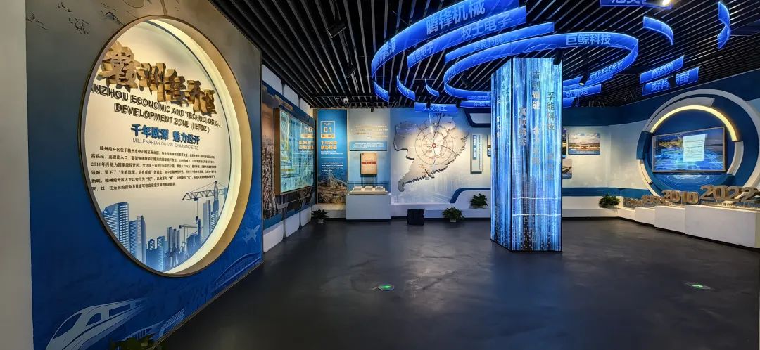 经开—千年欧潭 魅力经开,经开区展厅整体采用了蓝白的配色,主形象结合了城市剪影,赣州西站黄金机场等基础设施,表现经开的城市发展与区位优势。中间的词云柱主要表现经 开区的重点支柱产业和支柱企业。