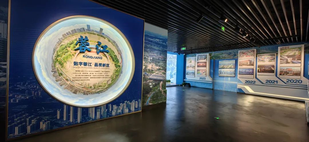 蓉江—数字蓉江 品质新城,通过造型形态、时间轴结合图文,展示榕江的飞速发展和城市面貌。运用折屏播放飞跃蓉江视频,通过数字多媒体的方式全景化展示蓉江的城市风貌。