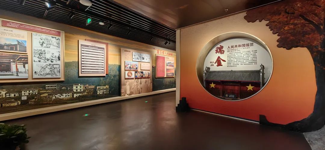 瑞金市:共和国摇篮—瑞金市,入口通过二苏大立体化画面和主形象结合天花、地面打造一个沉浸式的空间,透过主形象一苏大造型可以看到提灯晚会场景。