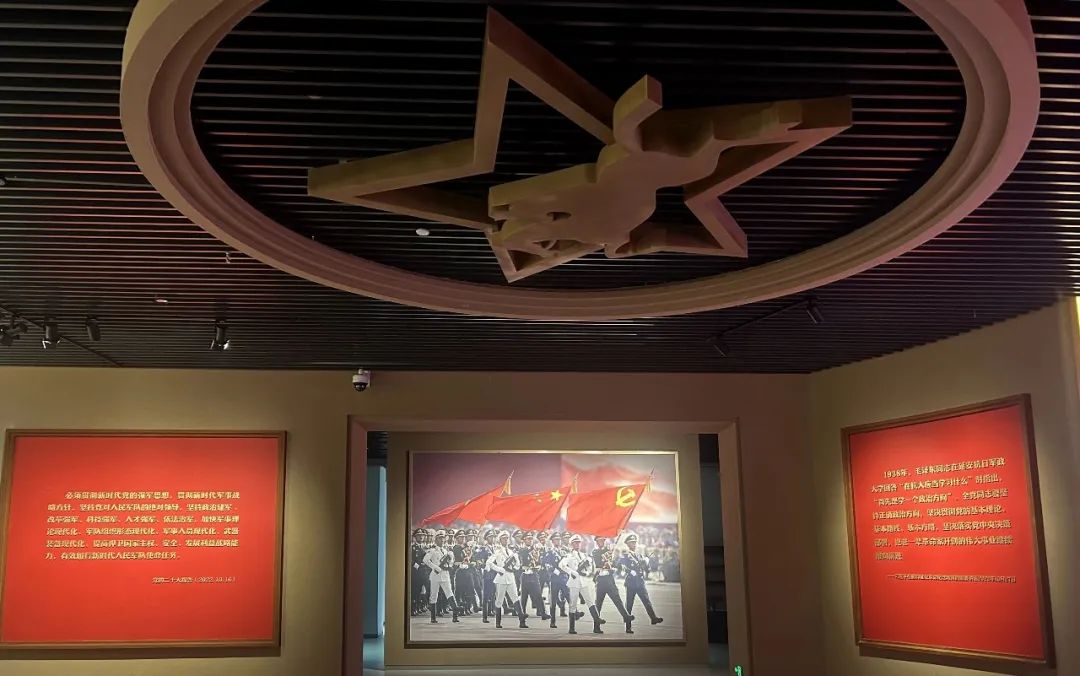 对抗大精神进行重点突出设计,强调从抗大教育方针到新时代军事教育方针,不变的是传承与坚守,变化的是创新与发展;在展厅的过渡空间进行延续革命星火、照亮真理方向的氛围营造,引导观众参观情绪的连续性,彰显精神信念的薪火传承;缅怀厅的多媒体编织花环和创新长明灯设计,将现代科技用于观众情感、爱国情怀的载体,是纪念馆陈列手段的创新探索;尾厅采用紧密环绕的设计语言,兼具宣誓、仪式活动等功能,突出展现习近平强军思想,强调新时代军事教育方针着眼实现党在新时代的强军目标,是在新的历史条件下对马克思主义军事教育方针的时代化发展,是立足国情实际、把握战争与军事发展规律、顺应时代发展要求,创新发展中国军事教育方针的使命担当。