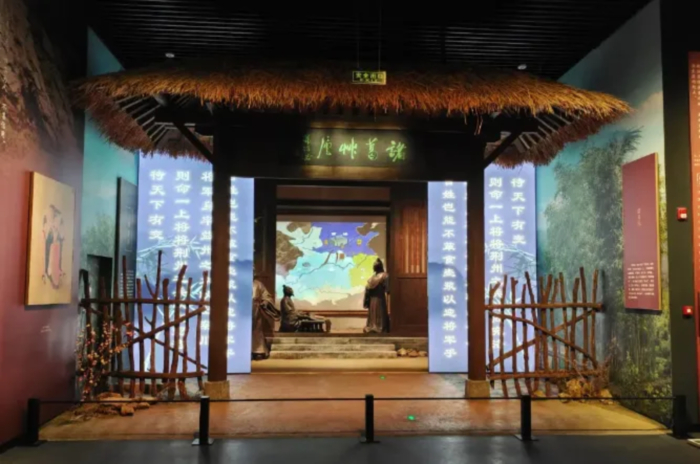 ▲针对三顾茅庐、隆中对这两件互相关联的事件,采用视频展演结合艺术品雕塑综合场景的方式进行剧场化、沉浸式演绎呈现。通过茅庐大门的移动屏的开合变化,实现视频内容和主人公艺术品雕塑的次第出现。