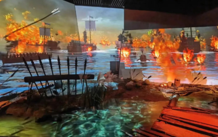 ▲宋蒙襄阳之战沉浸式空间,突破展厅中常见的沉浸式手段,将襄樊二城的地理关系进行解构表现,利用裸眼3D等技术,通过数字影片结合灯光音效场景等手段,打造独属于襄阳的古代战争画面。
