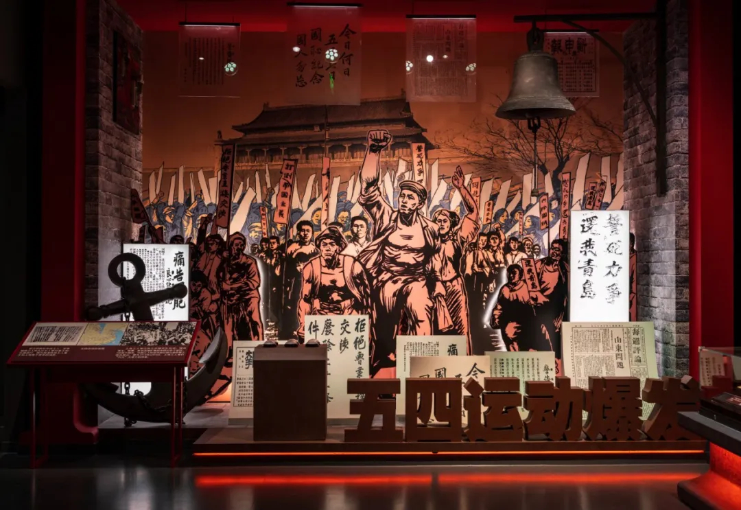 △在五四运动展区,红色景框构建起历史舞台意象,隐喻工人阶级冲破枷锁,开始以独立姿态登上政治舞台。