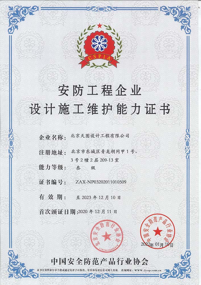 安防工程企业设计施工维护能力证书叁级