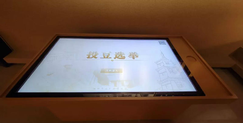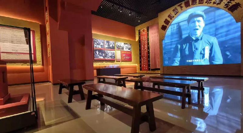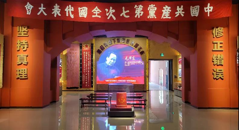 例:七大会址仪式化空间里设置有长条凳,观众置身仪式空间中以七大会议影像为精神启示序列,引发观众对七大会议精神的认知。