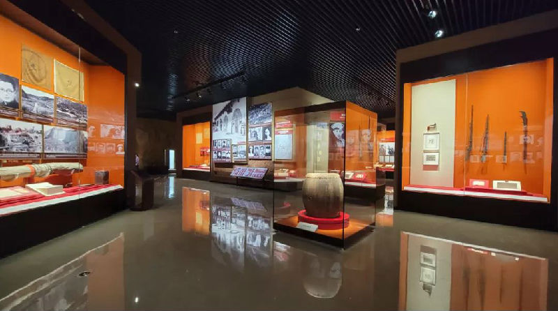 构筑新时代红色展陈色彩和质感的创新性发展。首先,打破一般纪念馆千遍一律的灰色、大红色的色彩体系,结合陕北地形地貌、人文精神、革命历史等特点,选择土地黄、革命红相结合后的橙红、橙黄作为主色调,随着展览内容的深入进行渐变处理,彰显朴实、厚重、热烈、昂扬的环境氛围;其次,选用带肌理质感的墙面晶彩石材料,局部辅以陕北特色的土质、山地塑形,展览细节质感细腻、贴合主题。