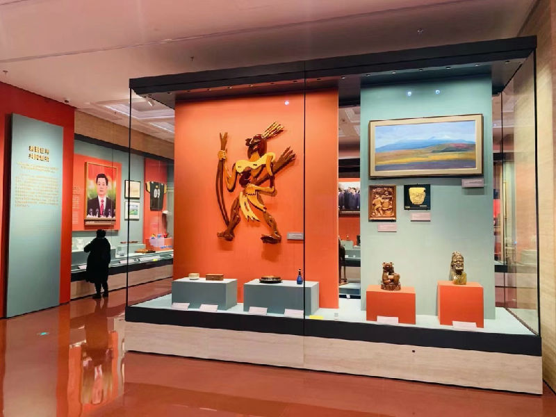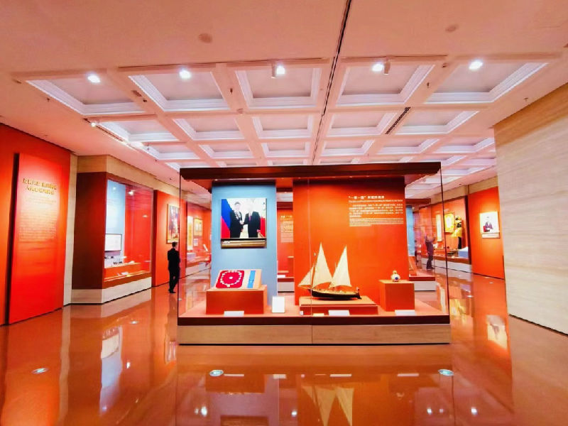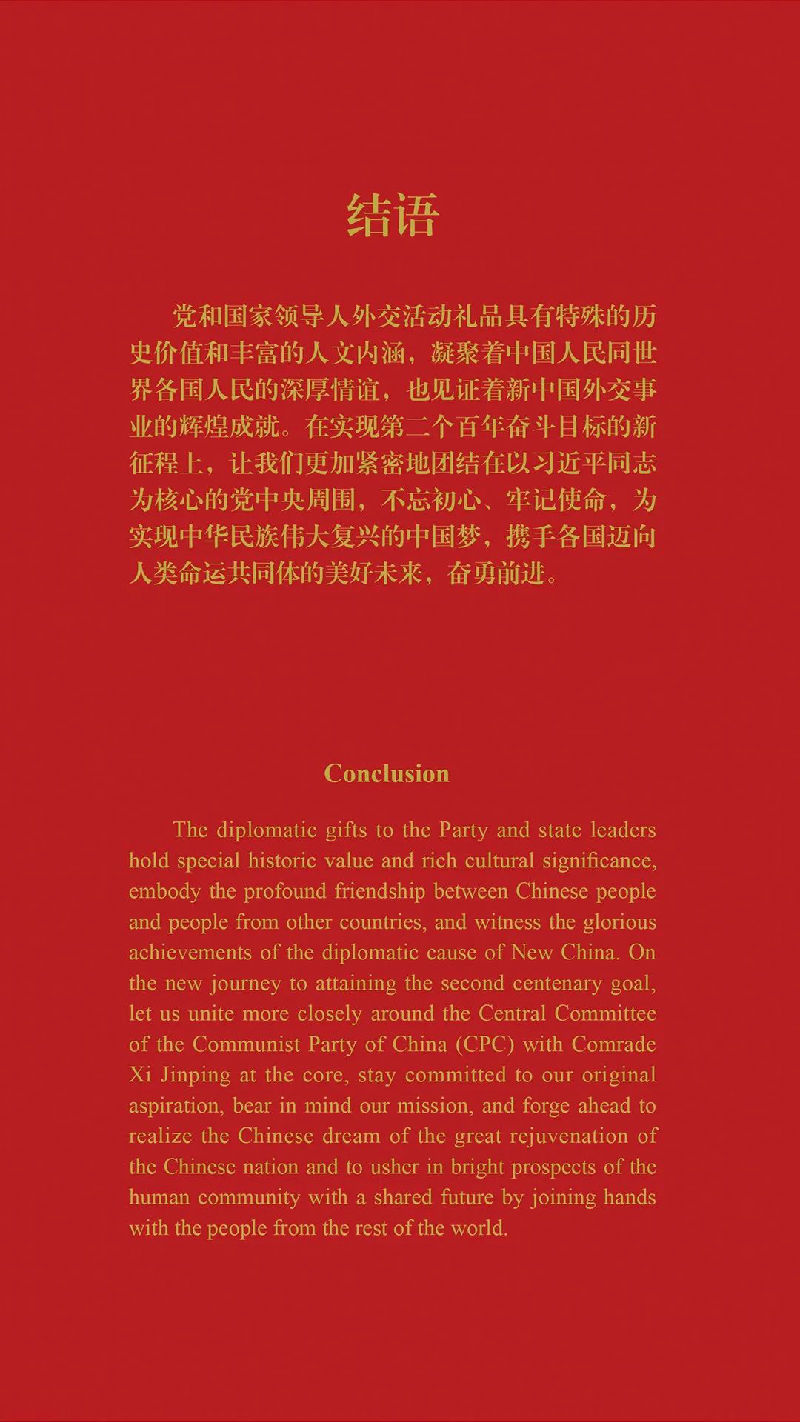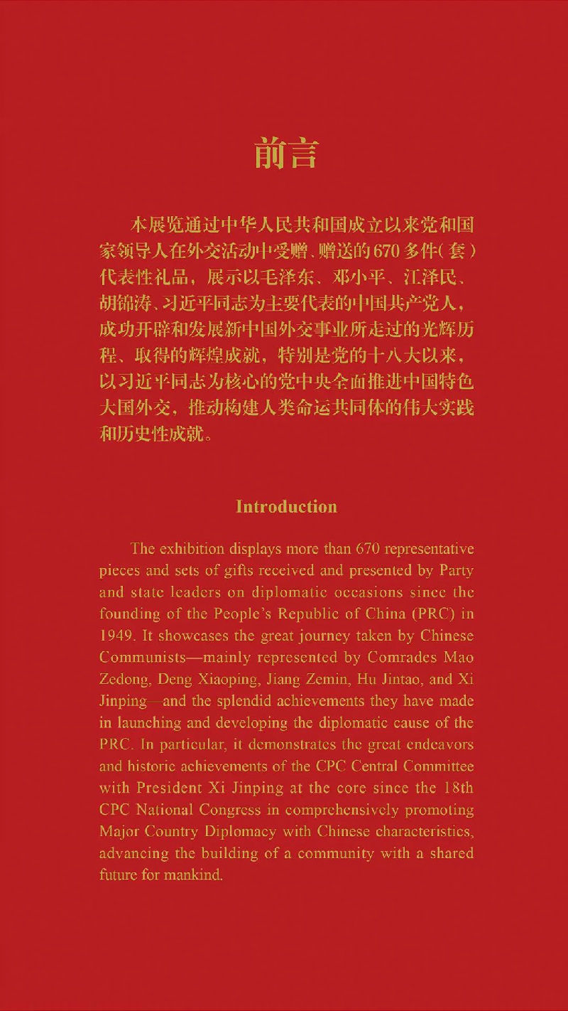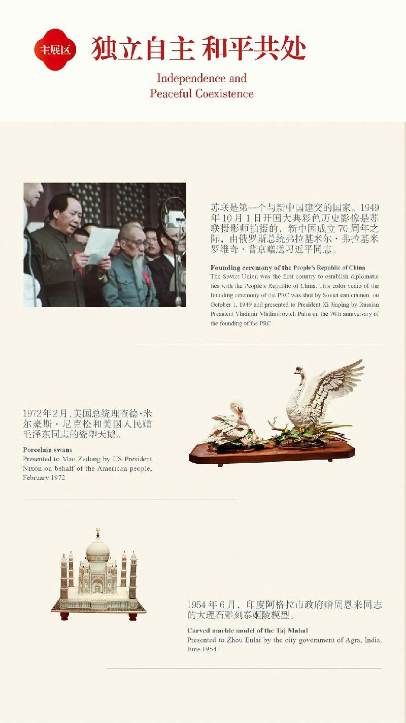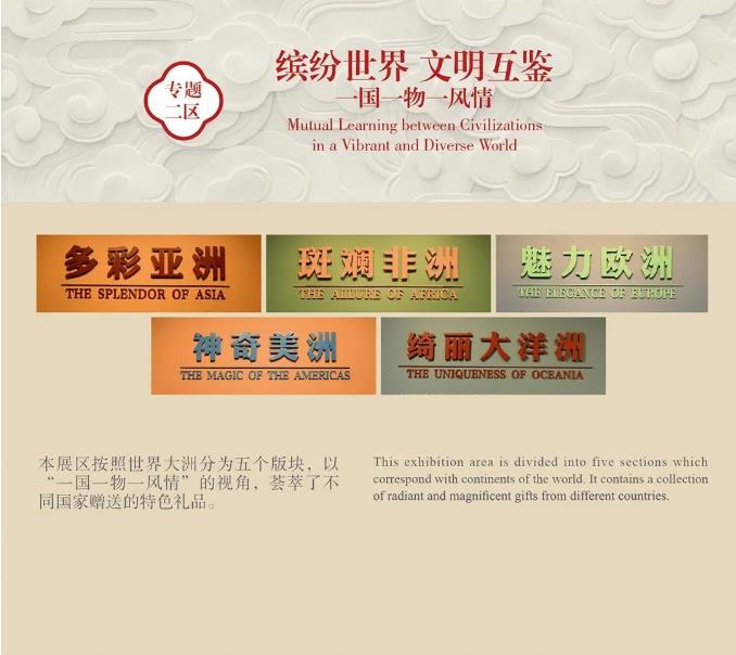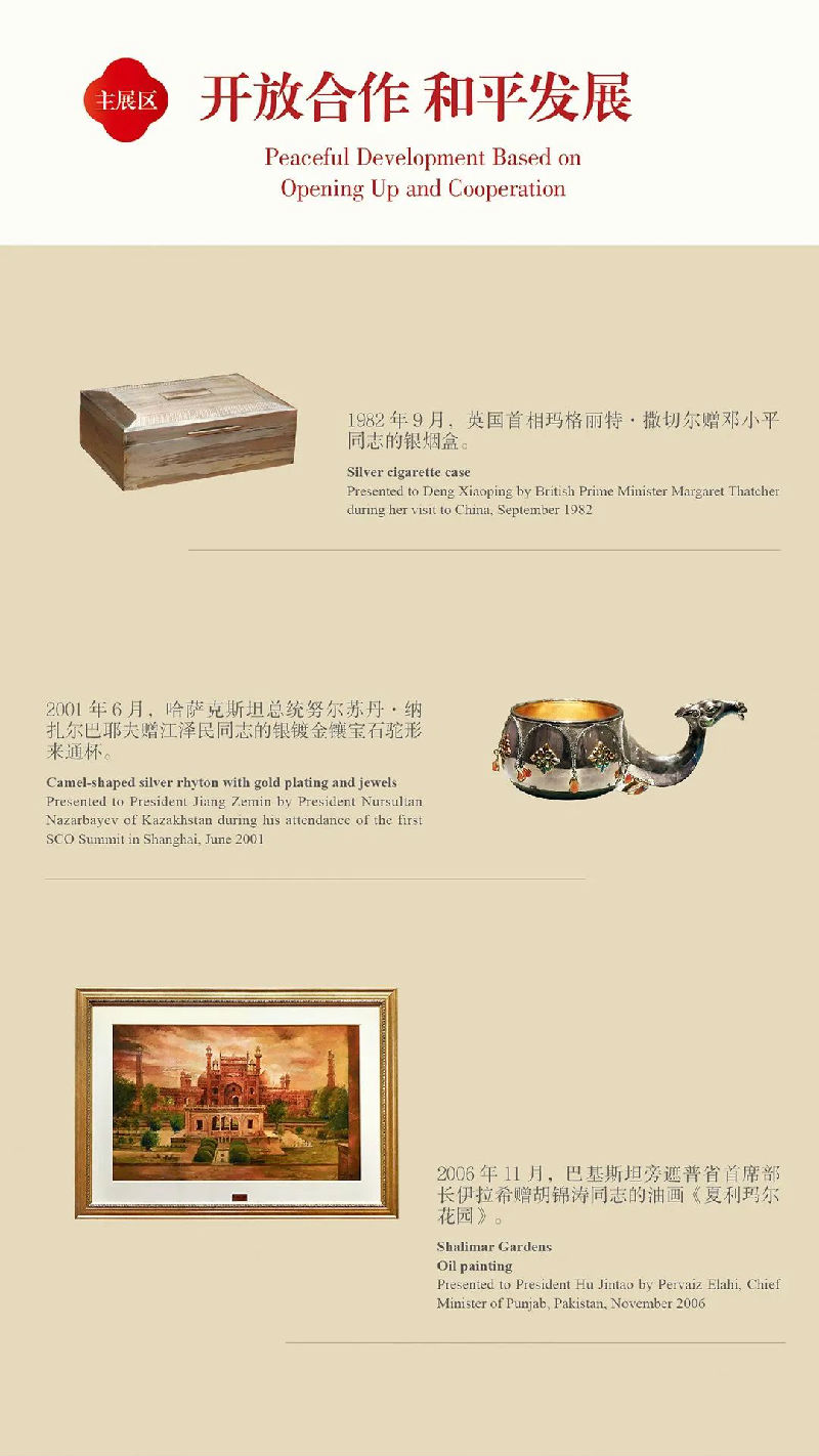 “友好往来 命运与共——党和国家领导人外交活动礼品展”设有一个主展区和两个专题区。主展区主要展示党和国家领导人在外交活动中受赠的代表性礼品,分为“独立自主 和平共处”、“开放合作 和平发展”、“大道同行 命运与共”3个篇章。专题一区主要展示党的十八大以来主场多边外交活动的对外赠礼,专题二区主要展示体现不同文明文化和异域风情的受赠礼品,分别以“世界舞台 大国担当”、“缤纷世界 文明互鉴”为题,共展出670余件礼品、40余幅照片和近百件文献、文摘、新媒体资料等。
