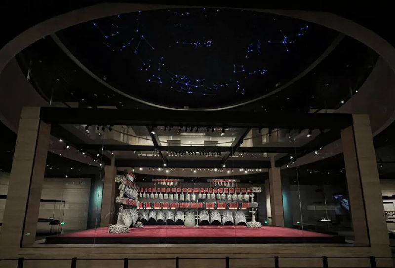 在编钟四周,编磬与编钟合奏、调音五弦器为编钟定音、敲钟木槌木棒演奏编钟,每个部分都以重点文物为圆心,涟漪般融合布置其他乐器文物,力求层次清晰,主次得当。