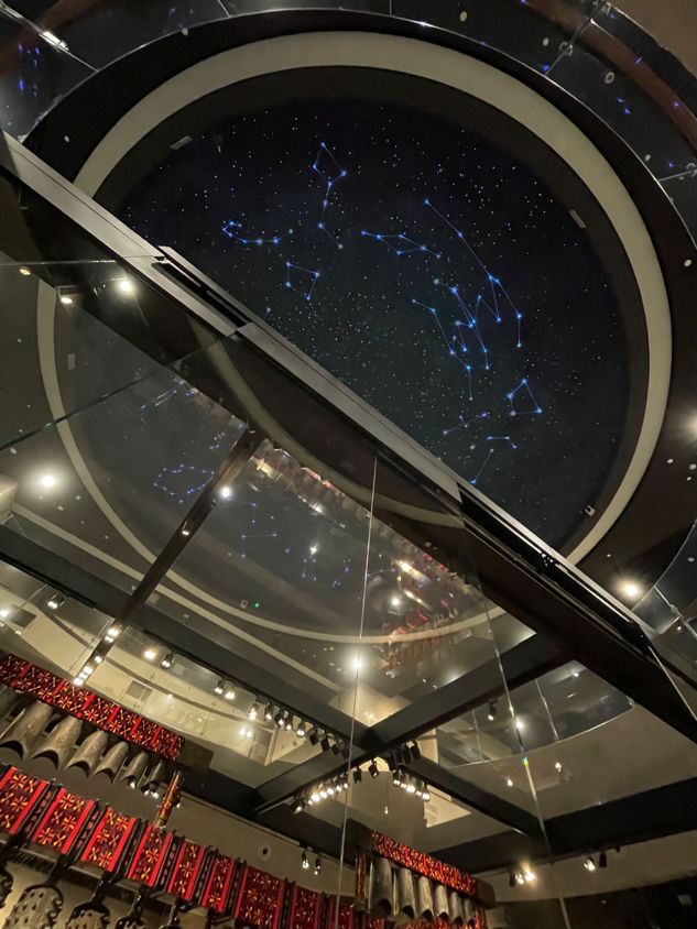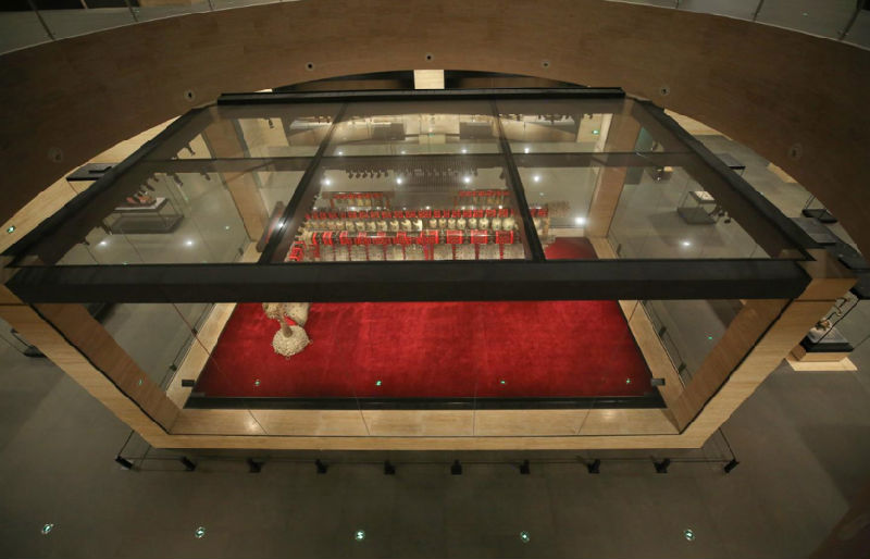 曾侯乙编钟是展厅的重心,我们为其量身制作了全球单体最大的编钟展柜。天井下的玻璃立方体储藏和展出了这件珍宝,使其置于天圆地方的宇宙图像之中。与此同时,展台将巨大的场地逐渐向文物集中,兼顾了自上俯瞰时的视觉效果。