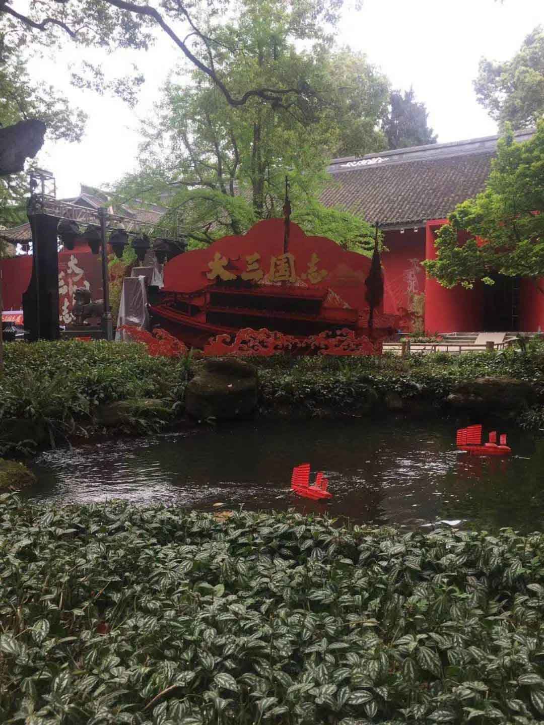 内外结合协调统一一室内展览以黑红色调相组合来烘托三国文化的大气传统,呼应三国历史的风云激荡。同时,导视导览、布艺帷幔、河道中用红色战船模型再现的赤壁之战场景等室外氛围布置,让三国故事贯穿博物馆室内外,也让观众的体验情绪在空间上得以延伸。
