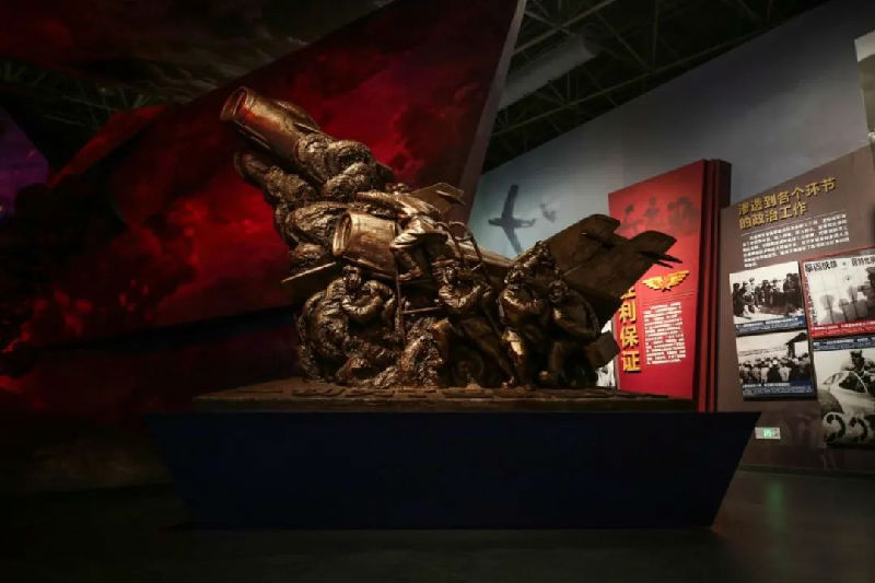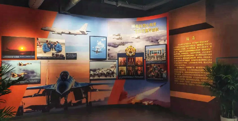 在展览的设计中最精彩的看点是充分利用展馆的高空间天地环境,以超大尺度照片、超大尺度的异形空间场景营造了主题氛围,表现抗美援朝中志愿军空军与世界头号空中强敌的殊死搏斗, 以弱制强的场景。志愿军战士用自己的身体保护了飞机,逼真的艺术化雕塑生动的向观众传递这种舍生忘死的精神和情感、通过写实与写意结合,装置造型与艺术创作油画结合的语言,场景艺术造型与多媒体从视觉上感受到“空中拼刺刀”的精神和“人民空军奠基之战”的寓意,营造出“亮剑长空惊寰宇”的强烈氛围和精神内涵。