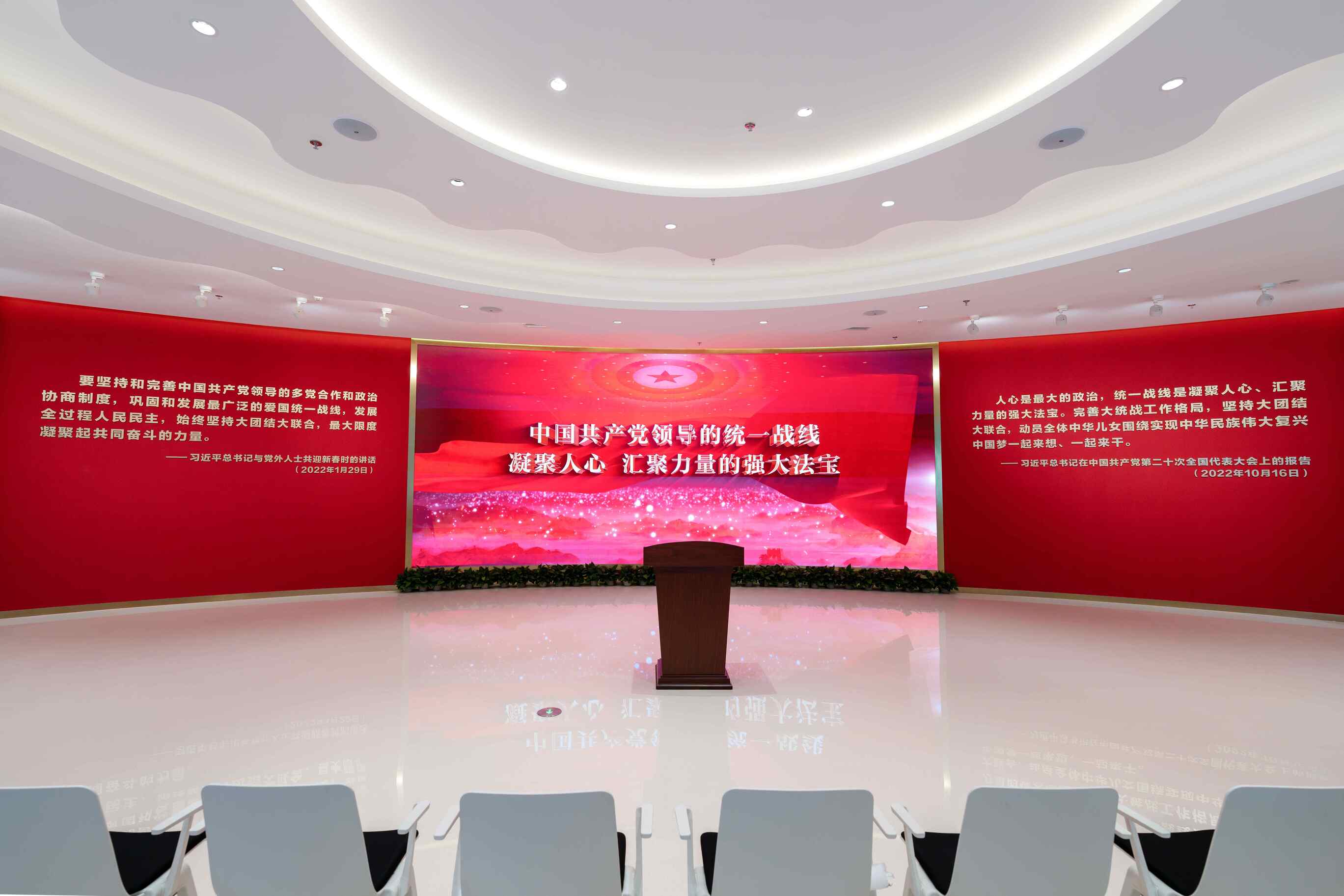 ◮序厅采用大型弧幕装置与习近平总书记关于统一战线及多党合作的重要金句大幅展板结合,全景展示了中国共产党领导的统一战线是凝聚人心、汇聚力量的强大法宝,给人以震撼的视觉体验。