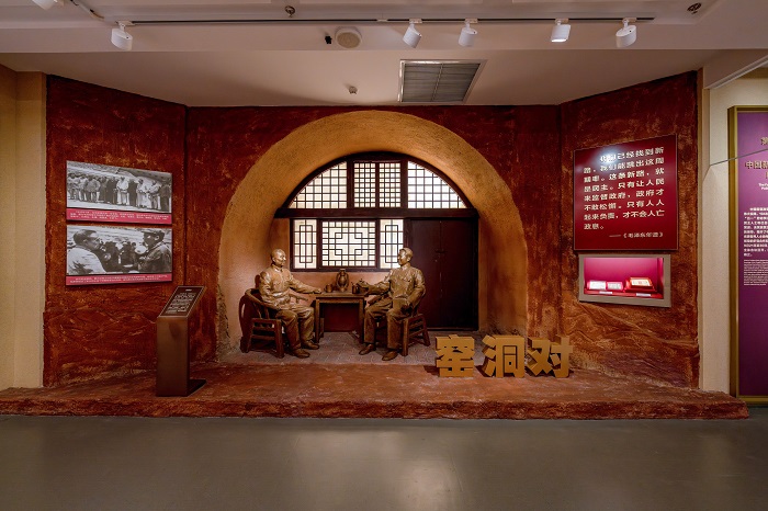 ◮以延安写实窑洞为背景,对延安时期毛泽东与黄炎培探讨如何才能跳出“历史周期率”问题的对话场景进行雕塑化设计、精细刻画,让观众更加直观地了解“窑洞对”的情形。