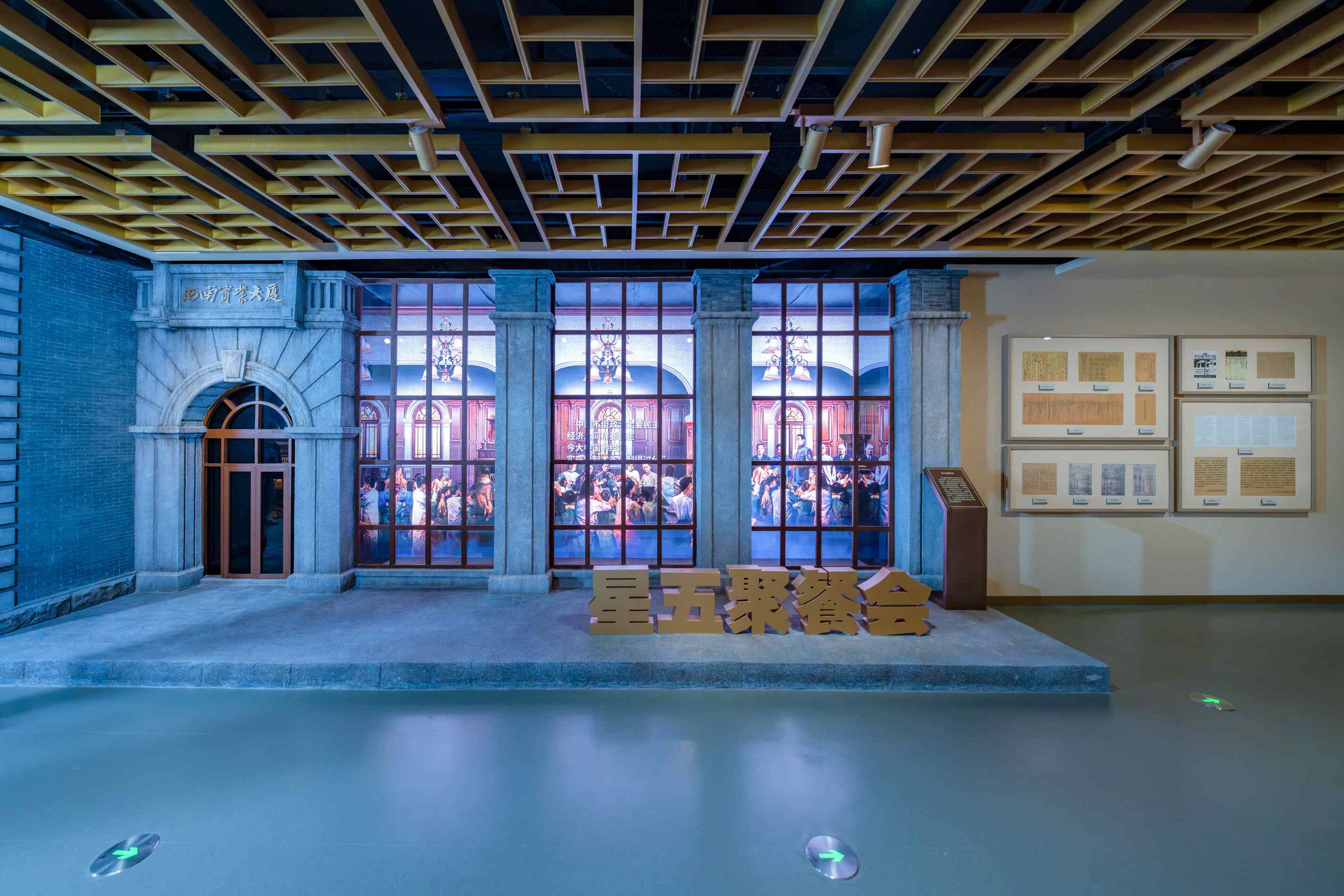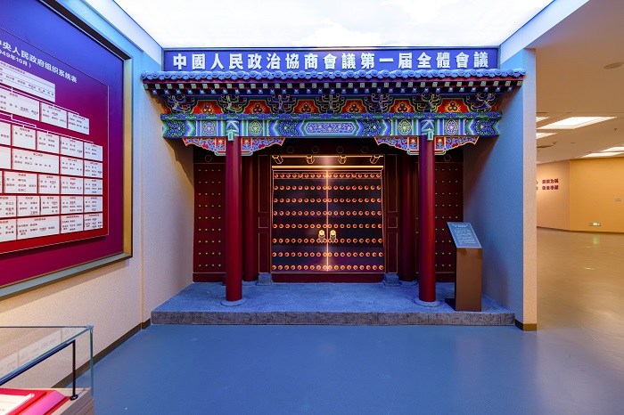 ◮中国人民政治协商会议第一届全体会议会址复原艺术化造型与大会影像结合,生动形象地呈现了第一届政协会议的盛况,在合理有效利用空间的同时,也强化了观众对该事件的认识。另外,顶部巧妙地采用张拉膜灯箱,营造蓝天白云景象,形成设计的无边界、一体化,有效破除了空间低矮现状,构建了顶天立地、开阔豁达的展示空间。