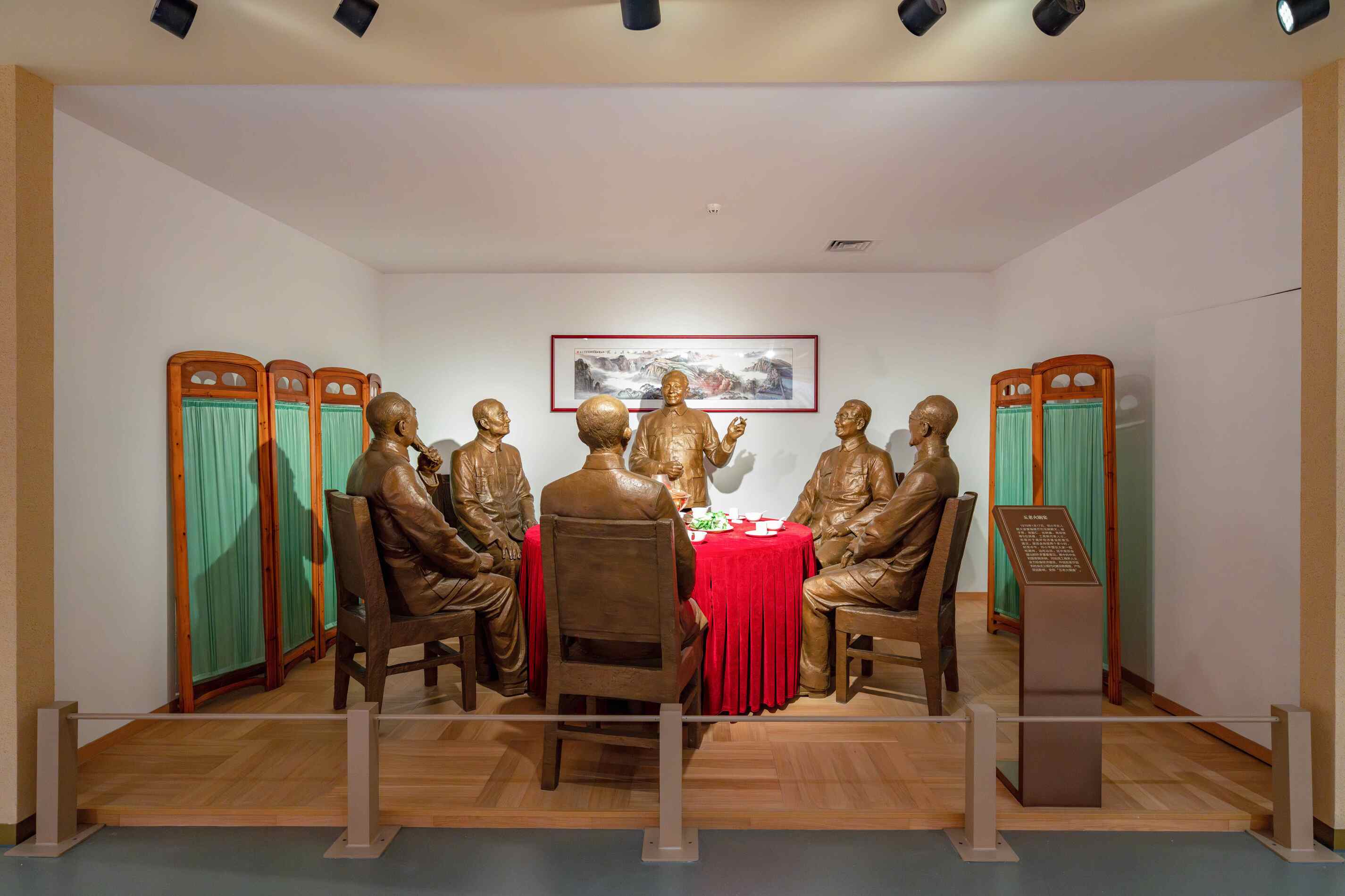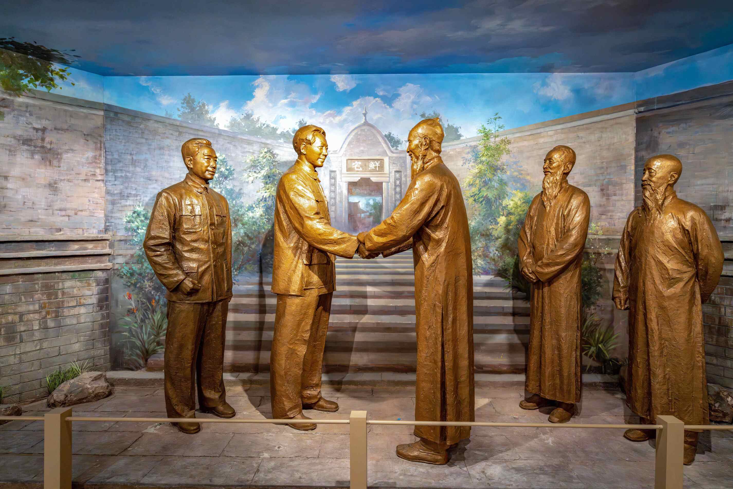 ◮以特园大背景画为衬托,设计毛泽东三顾特园会张澜等民主人士的主题艺术雕塑,生动还原张澜、鲜英、沈钧儒三人出门迎接毛泽东的场景,形象再现了中国共产党与民主党派通力合作、反对国民党独裁的光辉岁月。