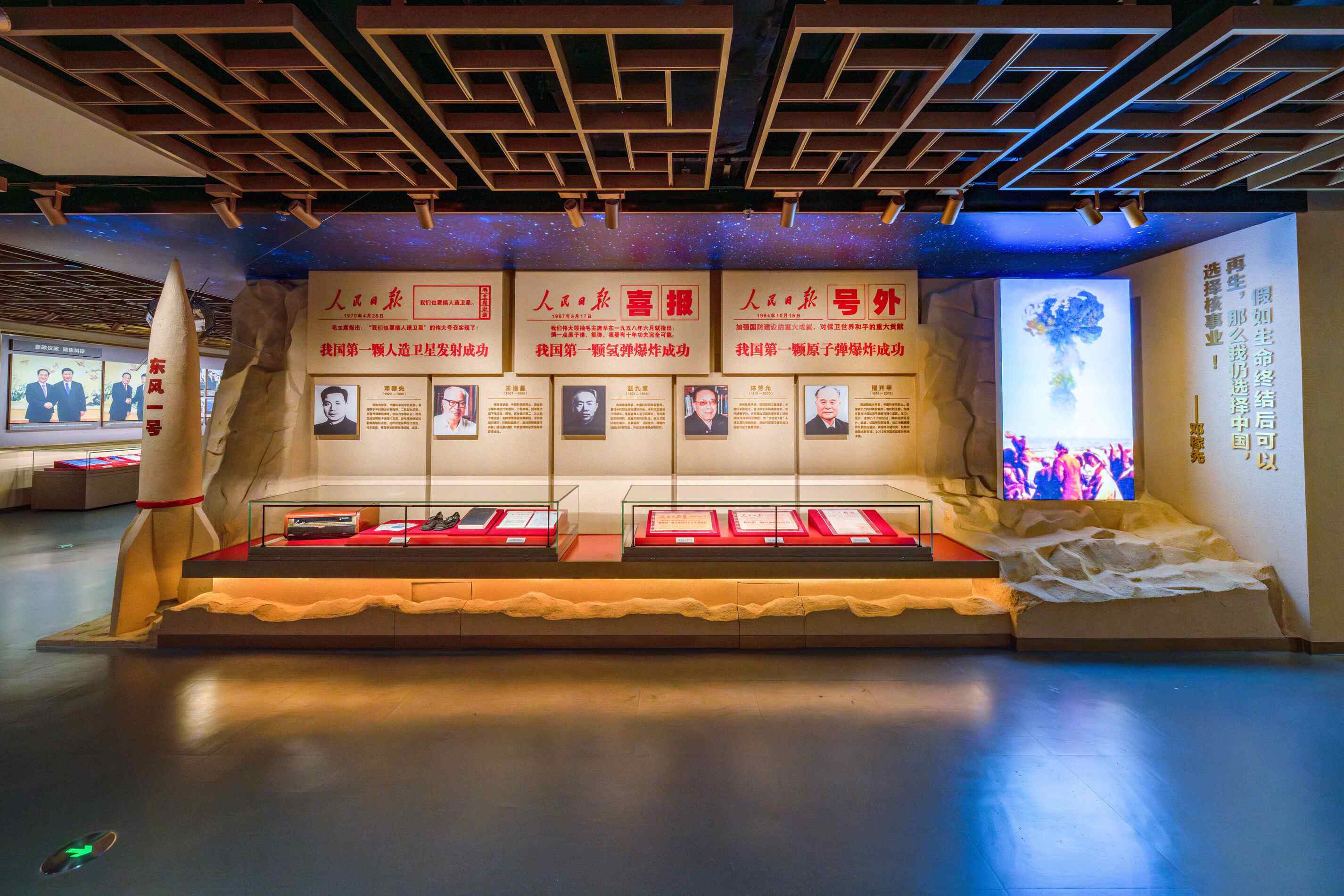 ◮通过“两弹一星”功勋典型图文、文件实物、勋章实物、导弹爆炸多媒体影像、新闻报道艺术造型、东风一号导弹造型等构建立体叙事,以突出的几何体块托举起功勋丰碑,系统形象地诉说着“两弹一星”研发的艰难岁月、巨大成就,体现九三学社社员为我国国防建设所作出的卓越贡献,给观众以强有力地感官冲击、形成共鸣。