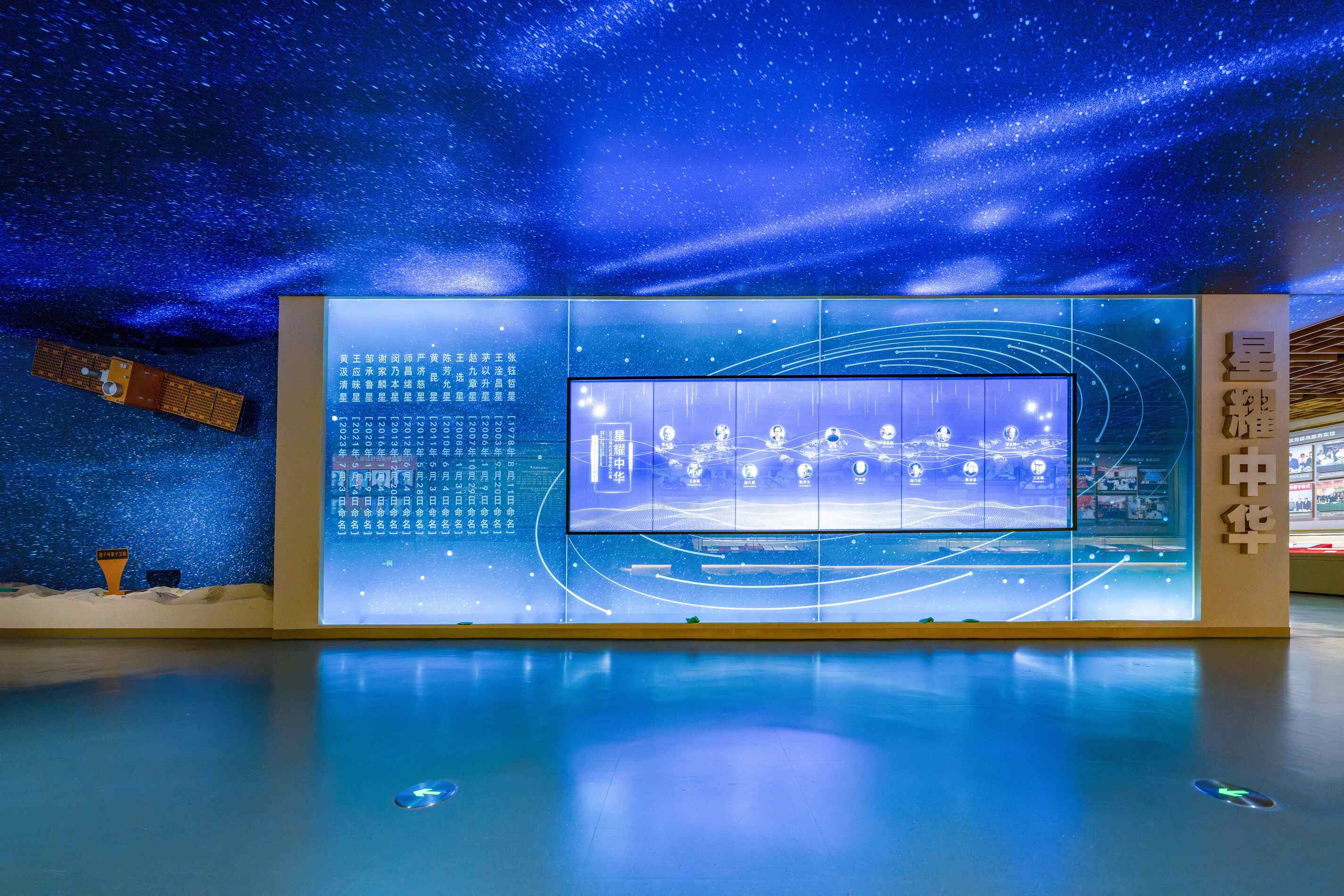 ◮结合九三学社社员科技界的界别特征,以动态灯箱营造满天星斗的沉浸式、科技范场景,大型交互魔屏以流动方式呈现王选等卓越学者人才画面信息,观众可通过点击查询更加详细的信息,整体性场景营造,烘托九三学社在科技界的重要地位、重大贡献,凸显九三学社特色信息的传达。