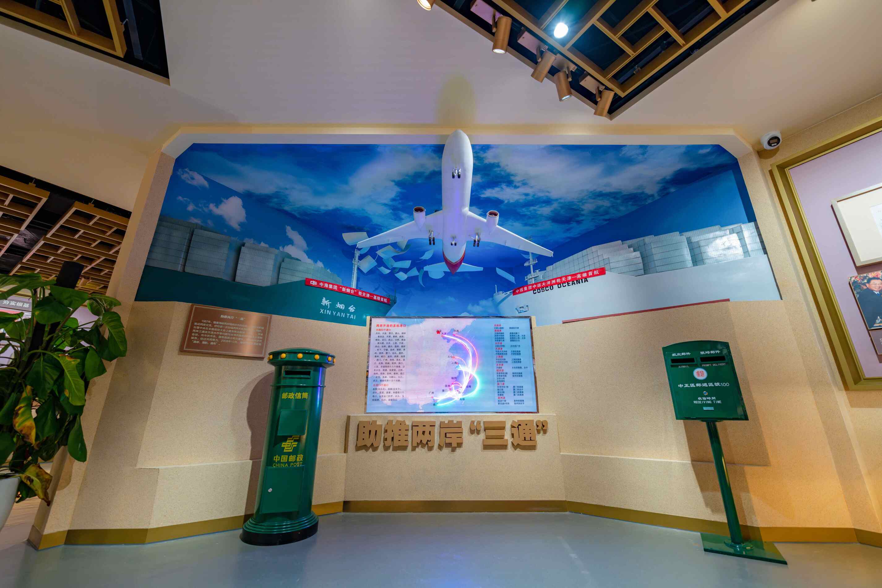 ◮通过微缩飞机模型、船模型、台湾邮筒造型、大陆邮筒造型与顶部灯箱、墙面喷绘相结合,天地一体设计,构建立体化、场景化的展示空间,丰富传达了海峡两岸交流交往和实现“三通”的情况。