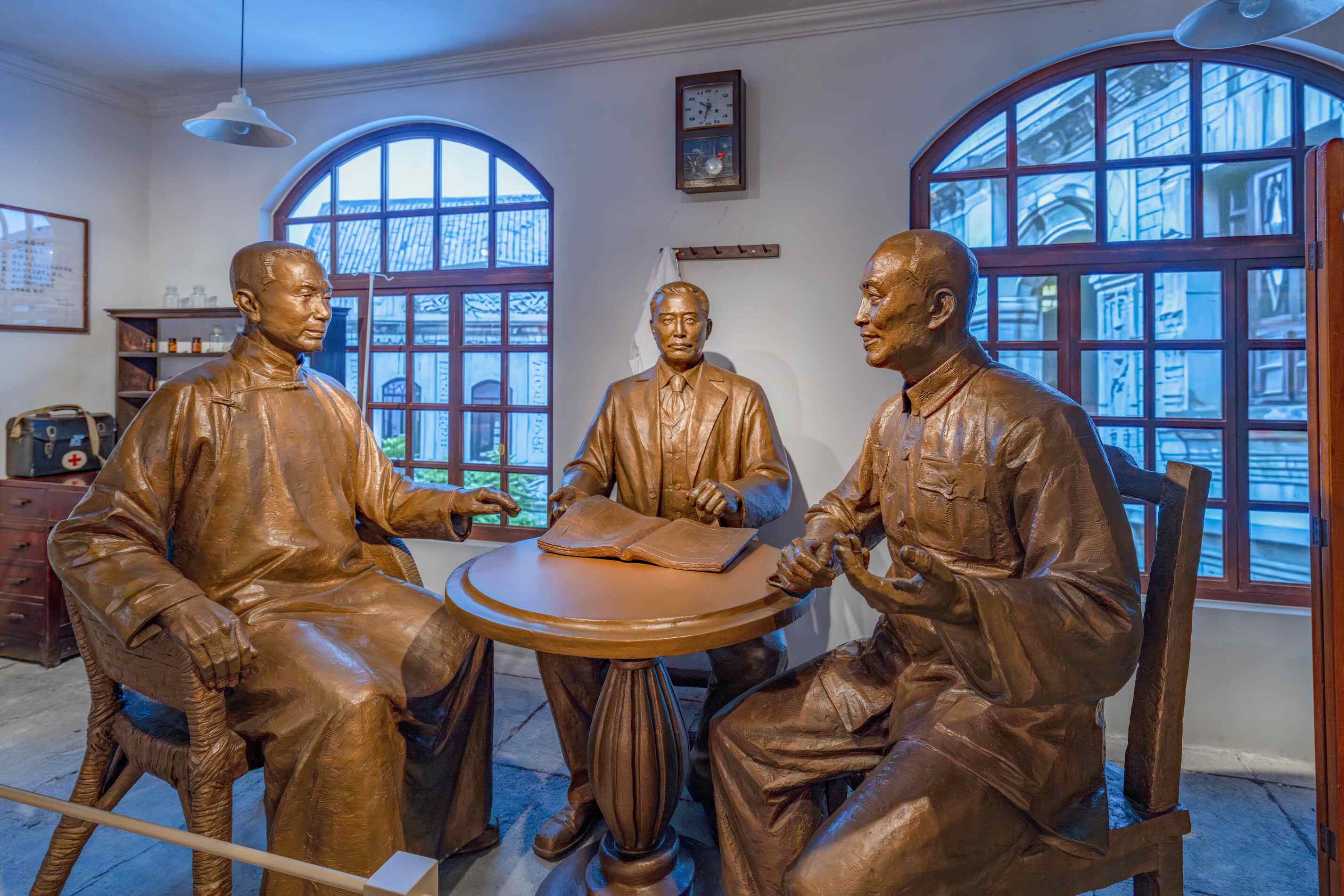 ◮复原黄鼎臣诊所,设计陈其尤、黄鼎臣和伍觉天商谈雕塑,创作窗口背景油画,生动再现致公党重组商谈场景,引领观众更直观、深刻地感受这一历史时刻。