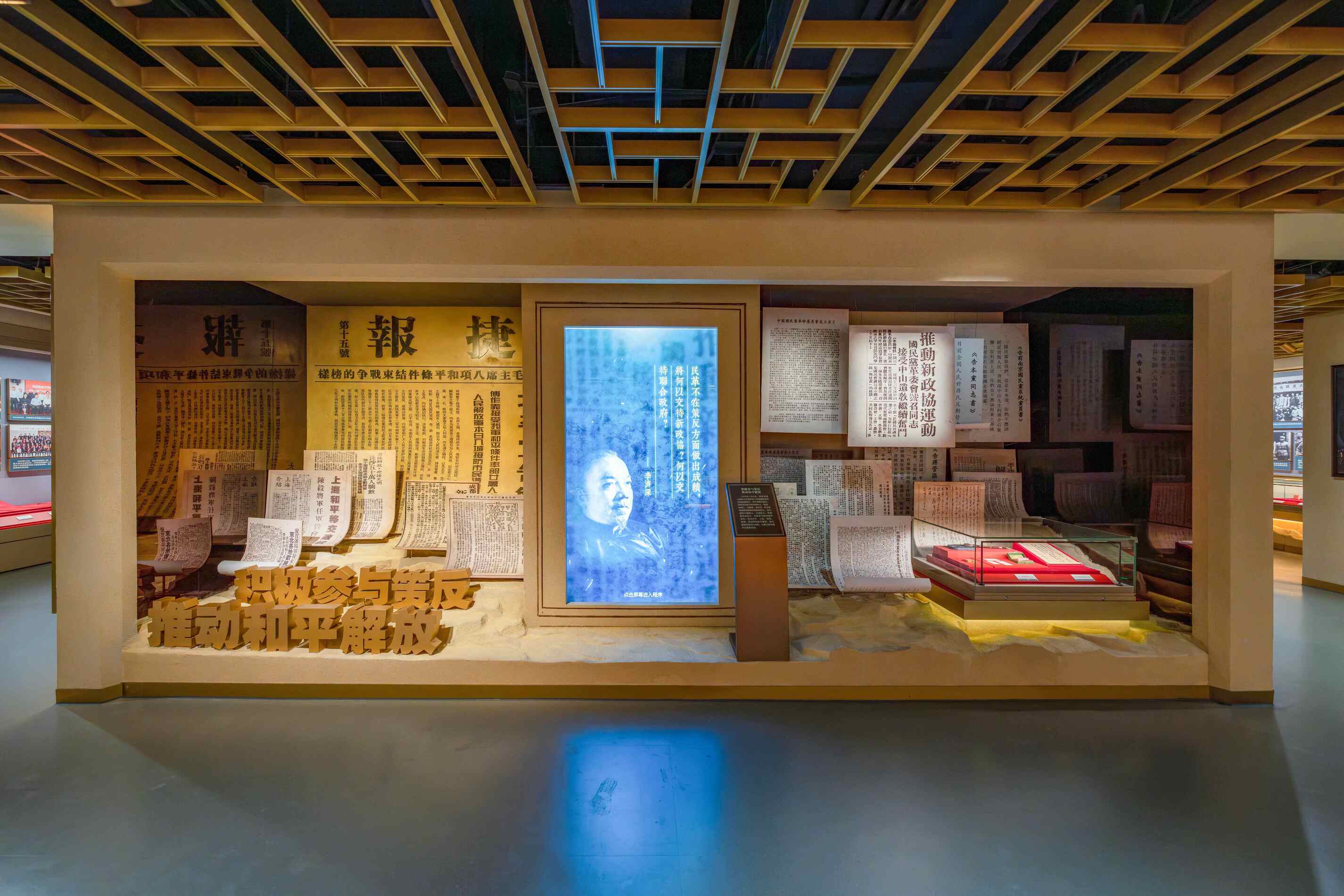 ◮左右两侧有效拓宽展墙纵深并设计墙面镜面,采用书信和报纸造型艺术装置、信件展品、多媒体影像和灯光相结合的展演方式,营造立体空间。右侧灯光照亮任一书信,中间多媒体屏幕播放相对应的信件内容和策反成功画面,以此来立体集中地展示李济深及民革向国民党军政人员发出亲笔信,策反投入人民阵营,推动和平解放的历史事件,形成视觉冲击。