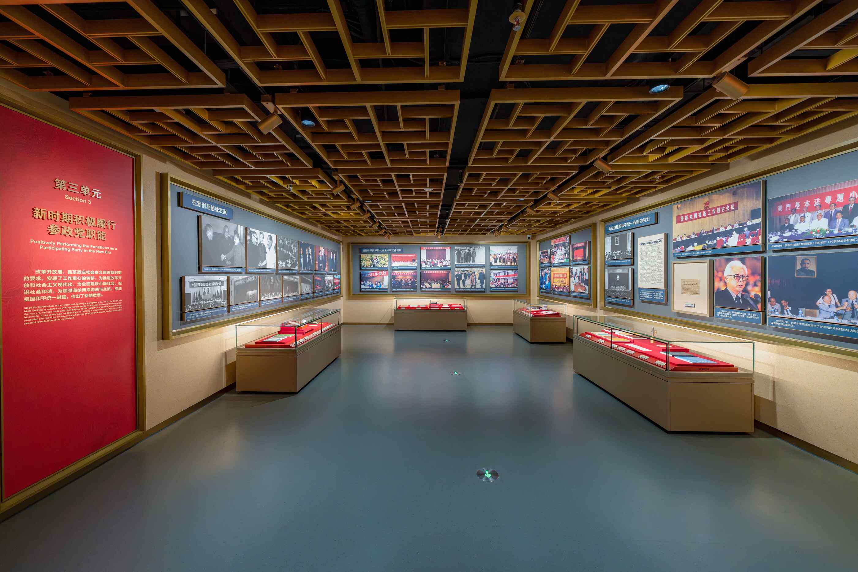 我们对中国共产党领导下各民主党派的辉煌历程和深刻内涵进行充分解读与阐释,明确整个场馆的总体调性,据此对部题版系统、色彩系统、辅助图形系统等进行统一规划设计,形成整体统一、脉络清晰、特色鲜明的序列化形式语言,建构起赋能体现各民主党派历史文化特征的系统化、统一性的形象识别体系。
