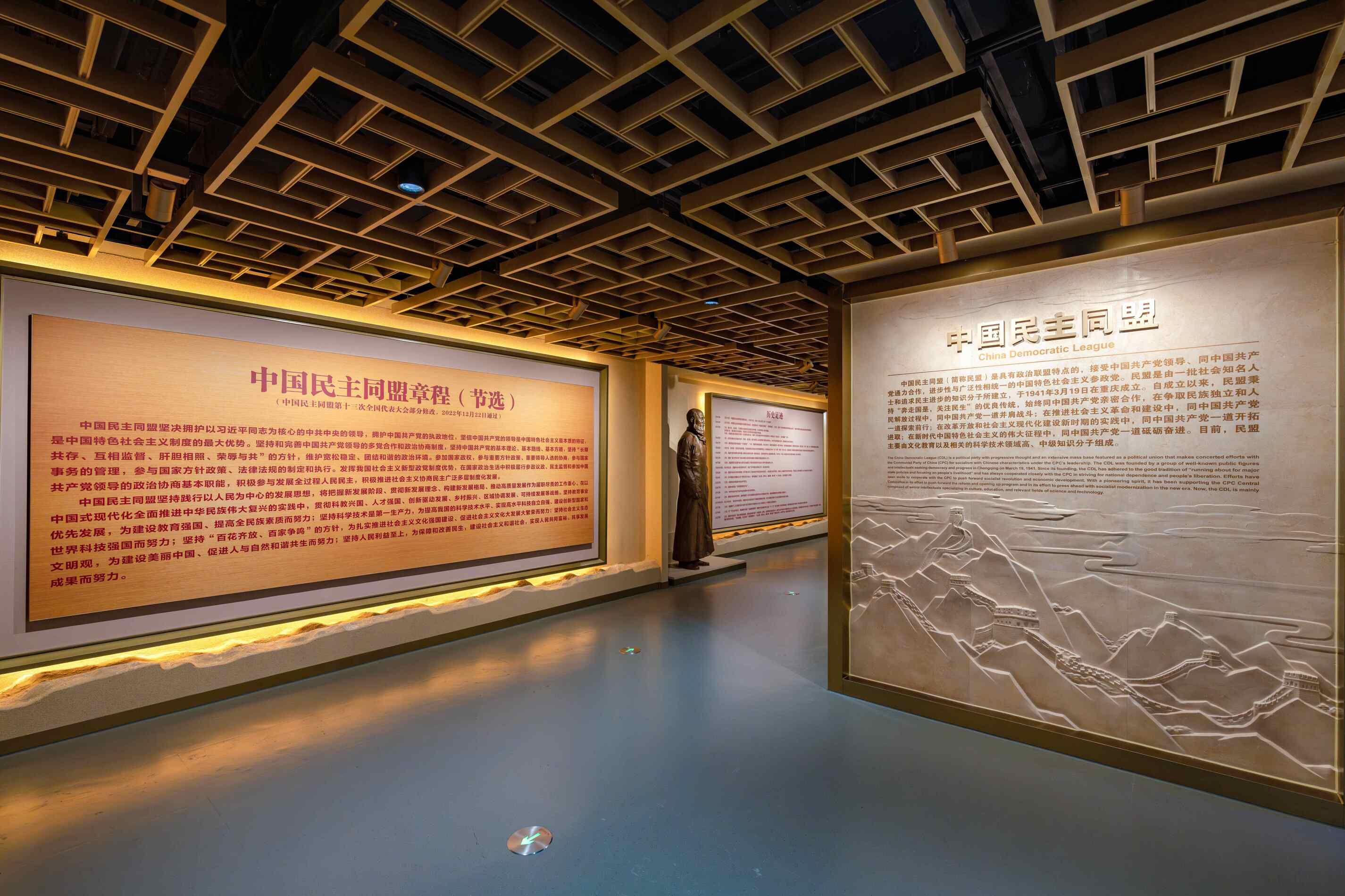 ◮挖掘党派的历史文化内涵和使命任务特点,提炼长城、山川、祥云等形象元素进行意象性、艺术化呈现,设计形成同材质、同色彩、同规格的一级部题版。以山川汇聚、长城凝聚的表达,整体建构起中国共产党领导下的各民主党派向心凝聚、团结合作,以米黄石材、金属质感传达厚重精神,建立垂直于空间、顶天立地的精神丰碑,同时开篇统一设计各民主党派主要创立者雕塑,整体上形成叙事逻辑和艺术设计相结合的序列化表达,彰显沉稳、庄重且极具张力。