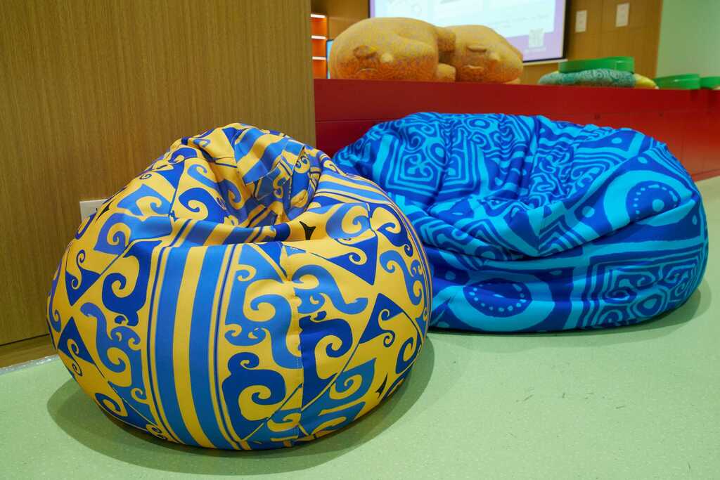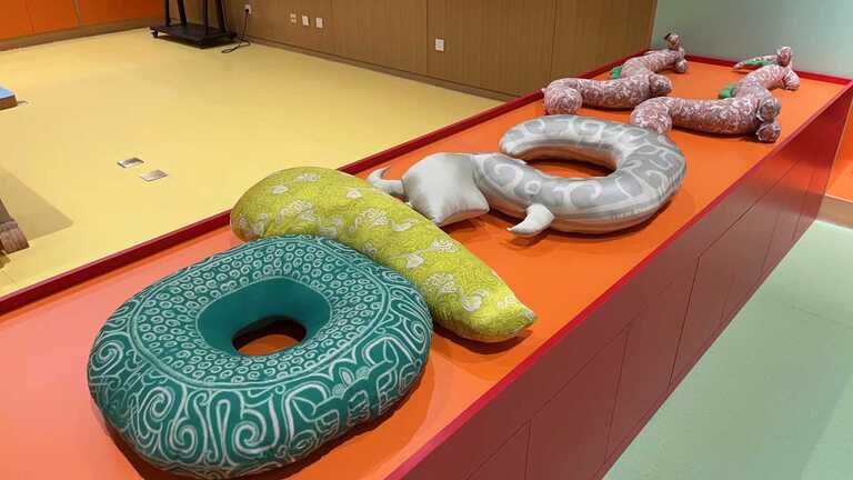 ◭可观可触-抱枕、懒人沙发,运用丝绸、棉、麻等不同材质,结合秦汉典型文物、特色纹饰,以艺术化呈现手段让孩子们切身触摸,真实感受秦汉高超的纺织工艺。