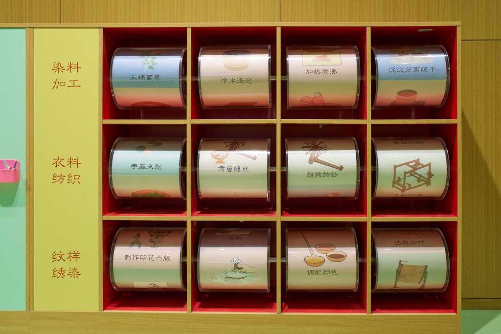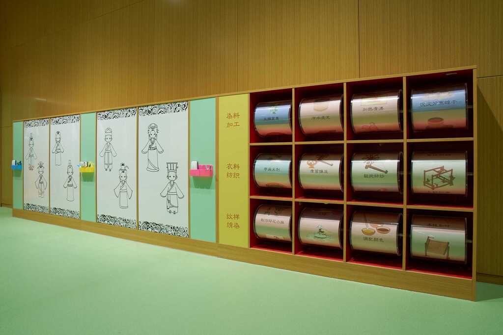 ◭动手互动-物理滚轮、填色,将秦汉织染工艺流程及服饰形制通过物理滚轮及填色形式构成信息带,孩子可在互动中学习历史知识。