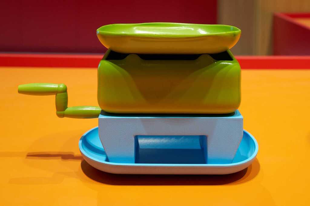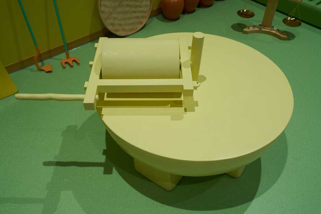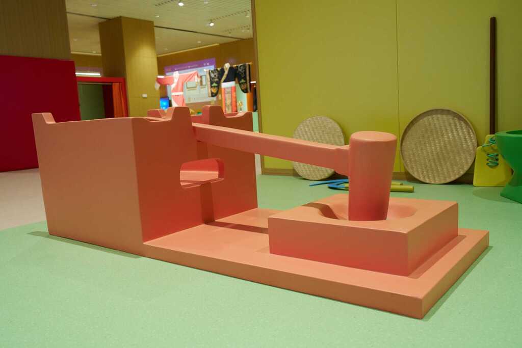 ◭具身体验-谷物加工互动,孩子们可以通过学习了解具体农具的使用方法,通过艺术化再现的秦汉加工农具,在现场进行实物演练。