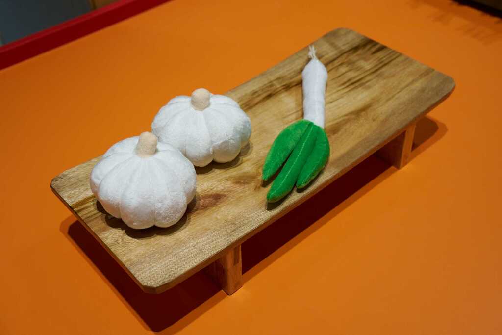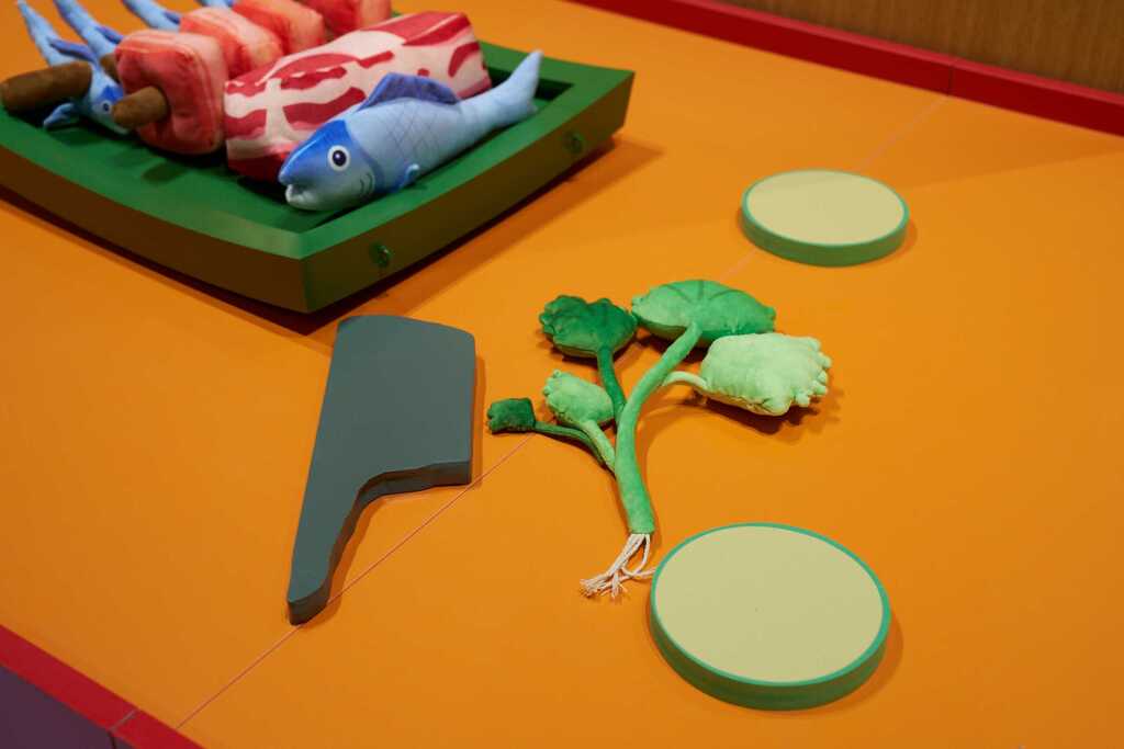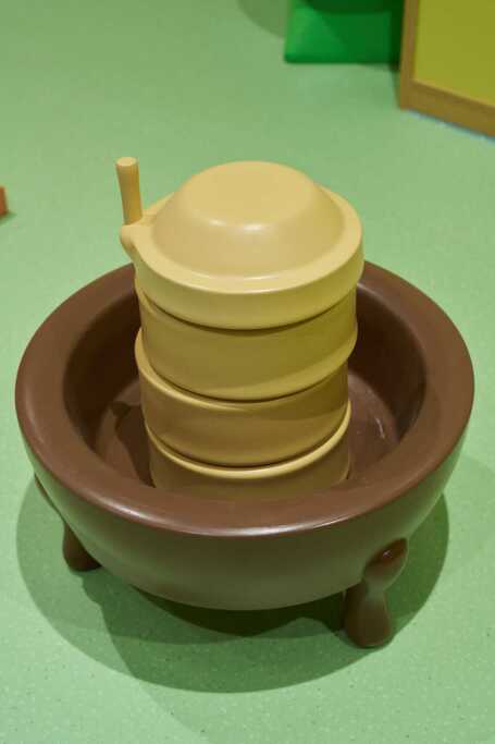 ◭具身体验-庖厨区,孩子们可以从食材架上灵活取用不同食材,在庖厨区通过秦汉炊具进行模拟化烹饪体验。