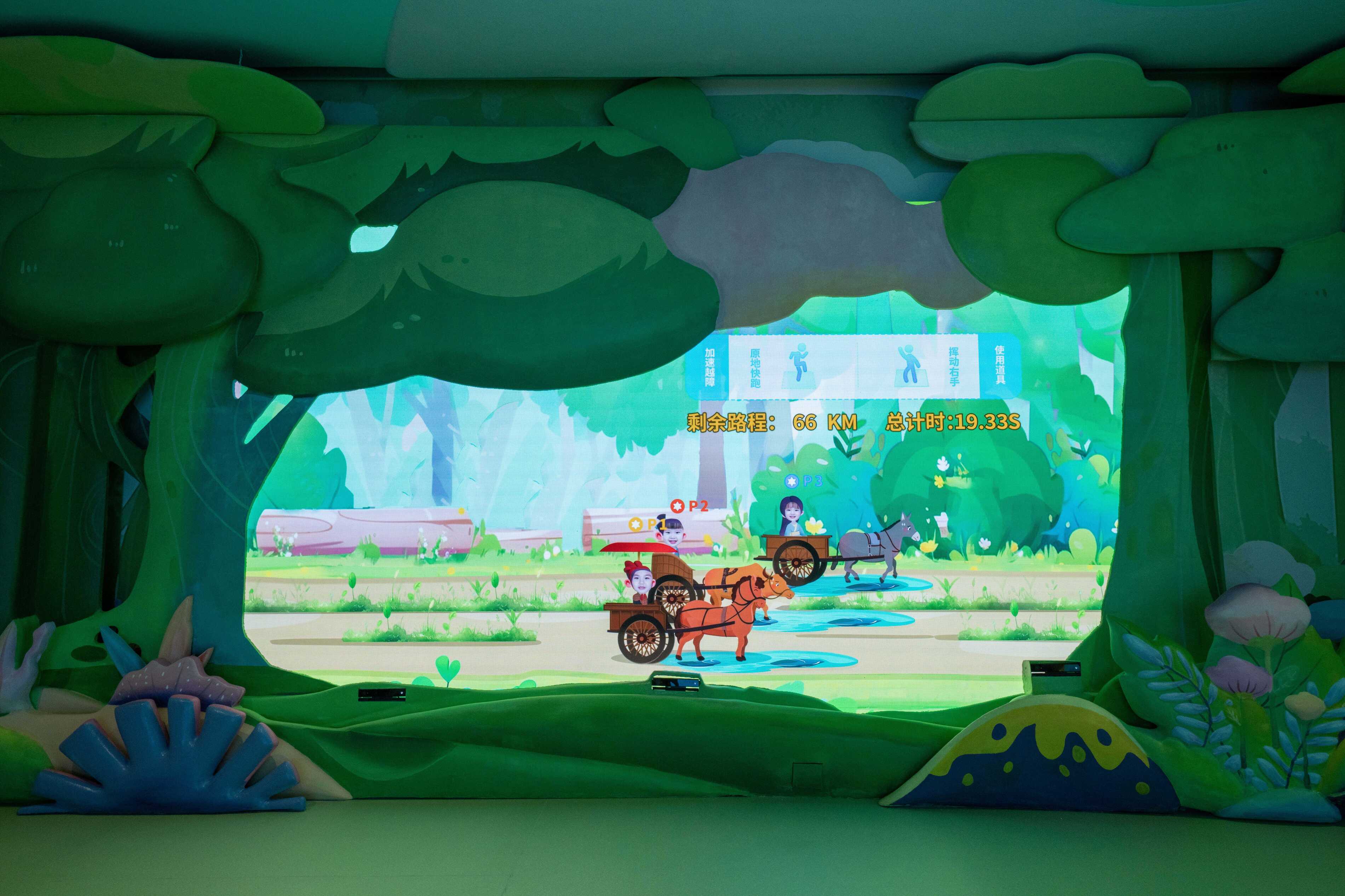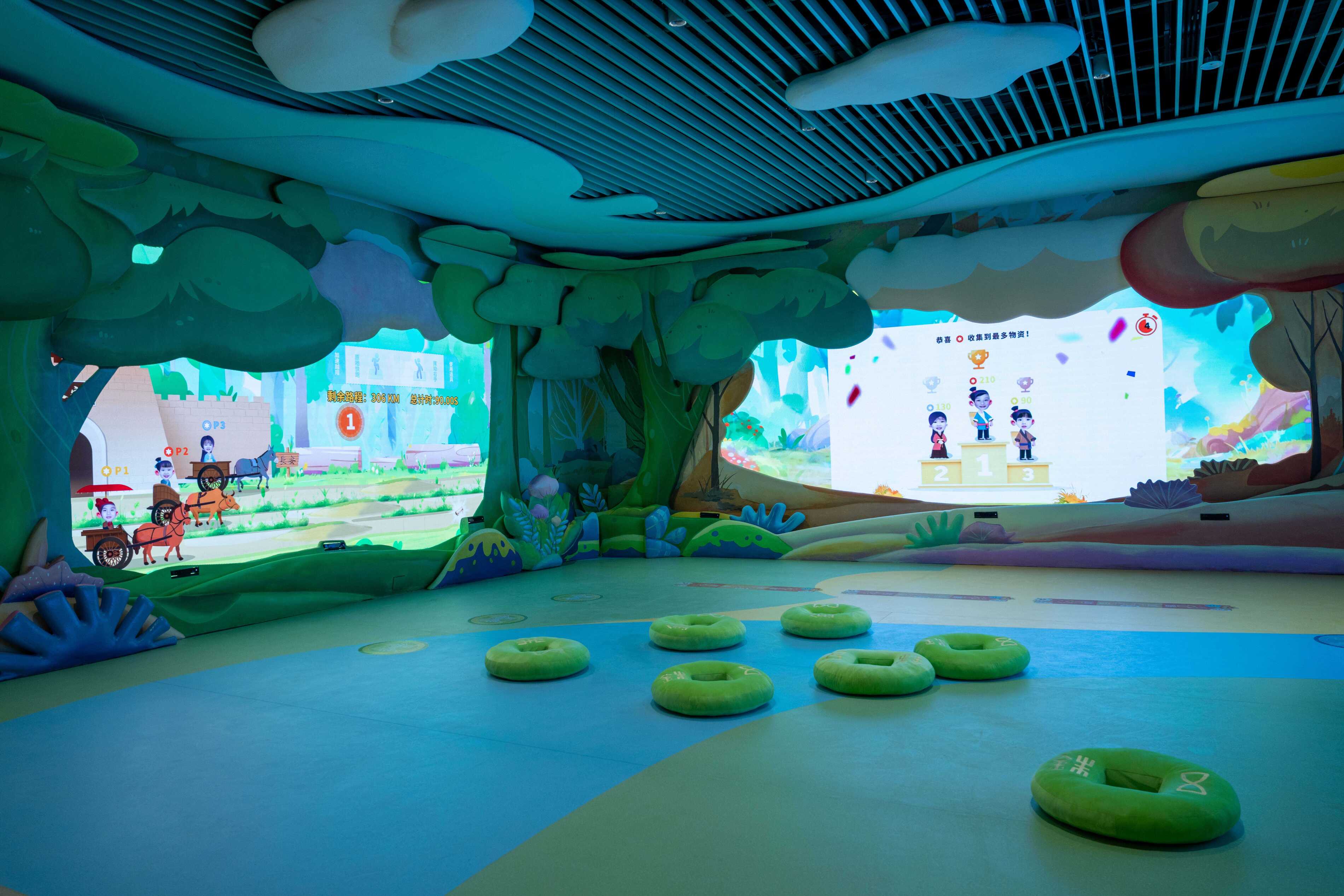 教育活动中心还通过故事化叙事逻辑,运用数字多媒体技术,打造了沉浸式交互体验空间。空间结合秦汉出行方式、地图、驿站等知识点融入,设有“徒步出行收集”“陆上交通工具竞速挑战”“水上出行互动”三大主题体感交互游戏,并以多重视觉艺术与实景搭建,共同构筑多样化、立体性体验情境。