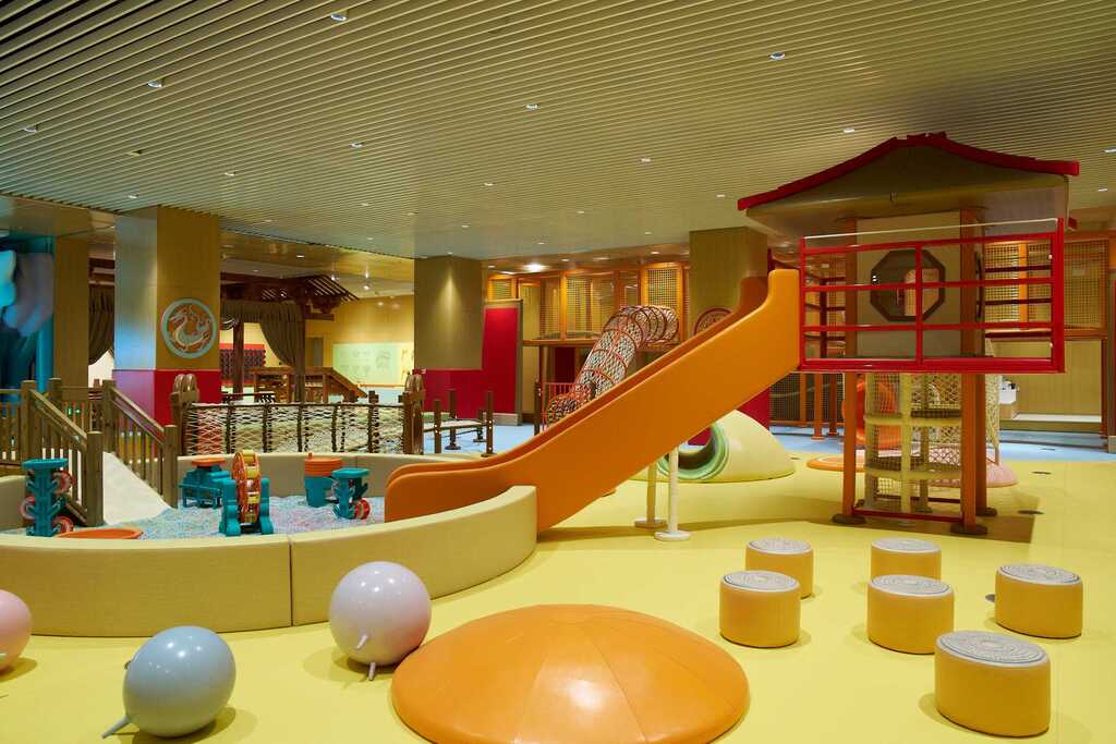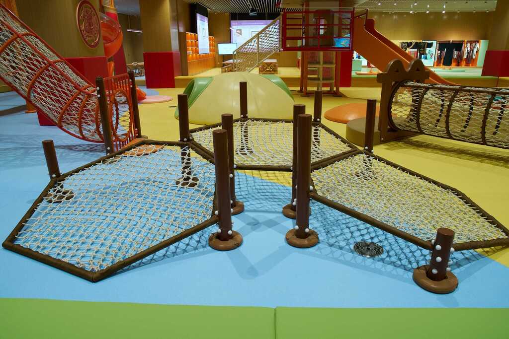 ◭游乐区,设有攀爬区、梅花桩、滑梯、蹦床等,设计以秦汉元素为主。可供孩子们在研学课间,或日常博物馆参观、休憩过程中娱乐互动。