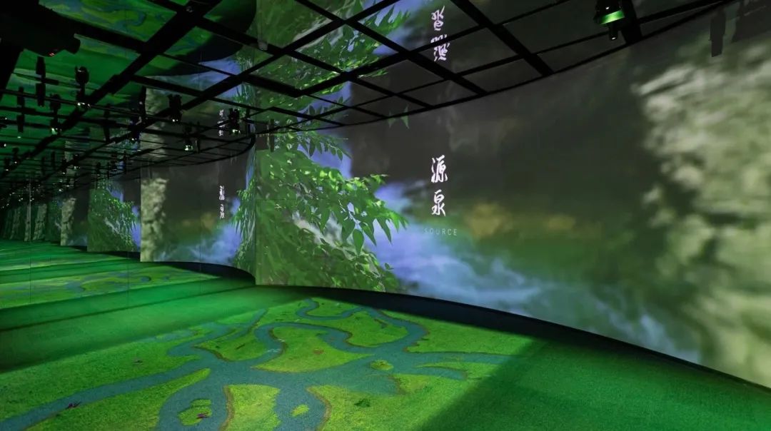 投影视频清澈的水、成熟的稻田、大别山的映山红等结合地面水纹科技互动,从上至下全方位、立体化打造一个步入式、沉浸式的体验空间。表达走进新时代,淠史杭灌区的兴建,彻底改变了江淮丘陵地区赤地千里的面貌,展现出“三秋桂子、十里荷花”的美景,成为旱涝保收的鱼米之乡。江淮大地也由水而美、因水而兴,呈现出一幅经济强、格局新、环境优、活力足、百姓富的新局面。