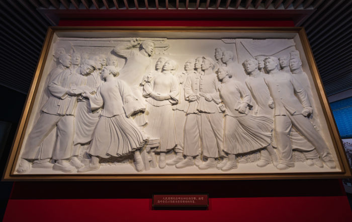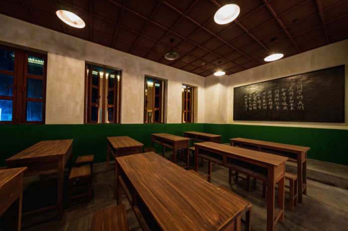 ◮在历史叙事中穿插复原毓文中学场景 ,形成“历史真实性”与“历史在场感”的沉浸式观展体验,让观众在空间中感知时代的思想脉动。同时对场景功能进行双重赋能,还可转化为观众休息区,打破了一般展览与观众“观看-隔绝”的单向关系,构建起“体验-参与”的互动逻辑。