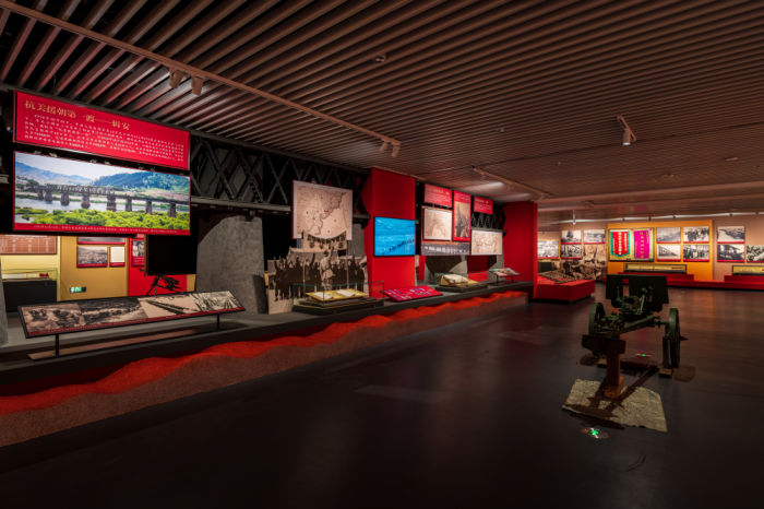◮“抗美援朝后援地”展区复原集安鸭绿江大桥局部,形成独立的艺术装置,重现志愿军入朝的壮阔场景;