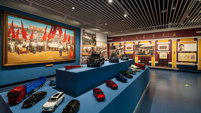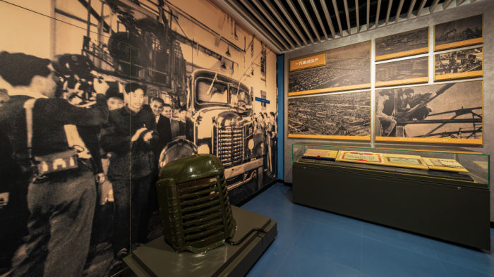 ◮“新中国汽车工业摇篮”展区以车模、第一汽车制造厂投产的喜报等实物,结合灯箱、图文展板、立体化剪影、展品、等形式,讲述吉林对共和国工业化的独特贡献。