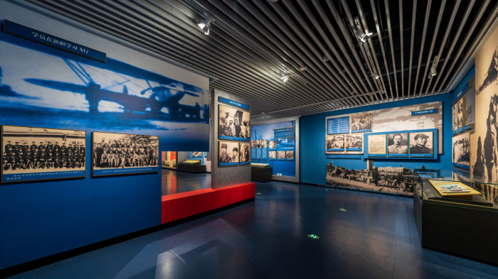 ◮“中国人民航空事业的摇篮”以还原到历史尺度的照片灯箱、档案展品、图文展板的组合形式展示“东北老航校”的建设,生动诠释“团结奋斗、艰苦创业、勇于献身、开拓新路” 的老航校精神。