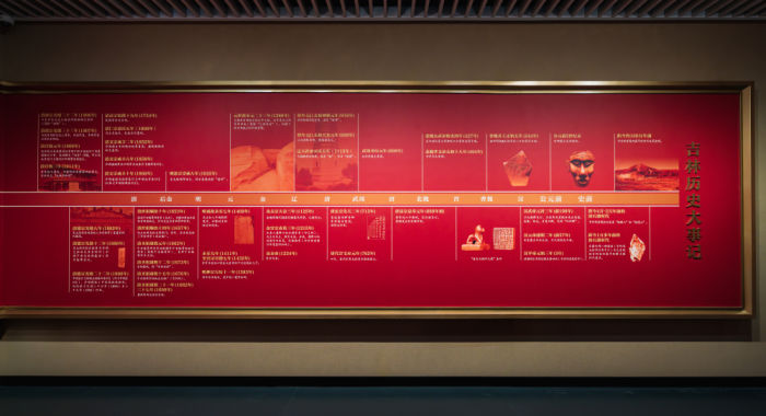 ◮序厅以主题浮雕开篇,搭配一条有形的吉林历史发展时间轴,形成强烈的视觉引导与精神洗礼感,让观众在一进入展区即完成“从现实到历史”的心理切换。