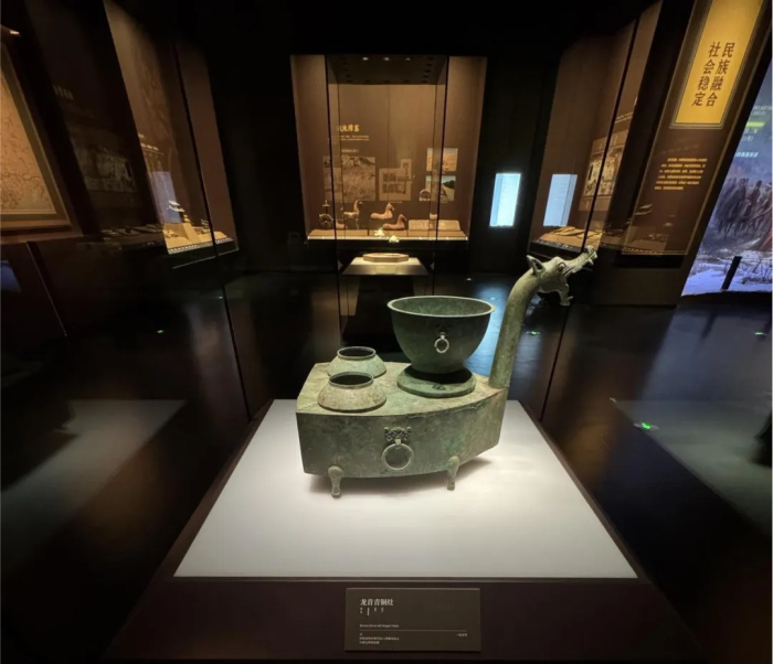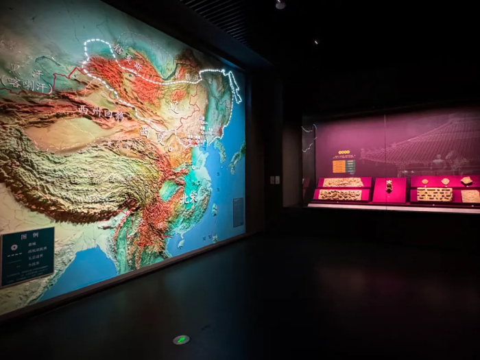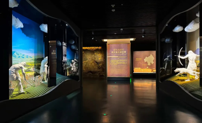 春秋战国至魏晋南北朝时期:本展区主要展示了春秋战国时期以及秦汉至魏晋南北朝的历史演变。通过精心打造的和林格尔汉墓沉浸式空间和昭君出塞的宏伟主题场景,生动地向参观者呈现了内蒙古地区中原农耕文明与北方游牧民族之间的交流、冲突、融合以及最终的升华。这一历史进程以汉代丝绸之路作为纽带,揭示了中国统一多民族国家的形成和发展的历史脉络。通过融合之路沙盘以及展区内的展品的布局设计旨在让观众深入了解这一时期的历史背景,包括政治、经济、文化以及社会生活等各个方面。通过互动式的展览和多媒体技术的应用,参观者可以更加直观地感受到历史的厚重和时代的变迁。此外,展区还特别强调了历史人物的贡献和影响,如昭君出塞的故事,不仅展示了个人命运与国家大义的交织,也反映了当时社会的风俗和人文精神。