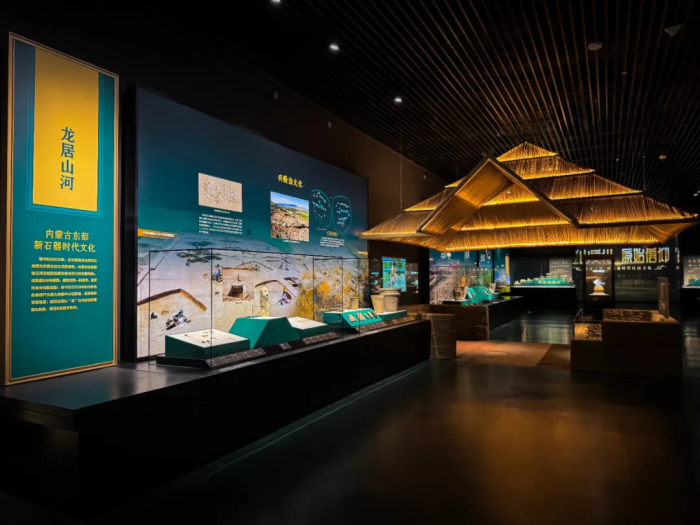展厅内部,我们布置了大量色彩丰富、设计独特的展柜,这些展柜中陈列着内蒙古地区70年来出土的具有代表性的文物,以及相关的考古学研究成果。这些文物和研究成果不仅揭示了内蒙古地区丰富的历史遗产,也展示了考古学家们在这一领域的辛勤工作和卓越成就。在场景刻画上,复原了金斯泰洞穴生活场景,以及红山文化石冢场景的沉浸式体验,还结合了多个遗址复原模型,采用了通俗易懂、深入浅出的叙述方式,旨在全面、系统地向观众呈现内蒙古地区从石器时代至夏商周时期在中国文明起源和发展中所扮演的关键角色和作出的重要贡献。