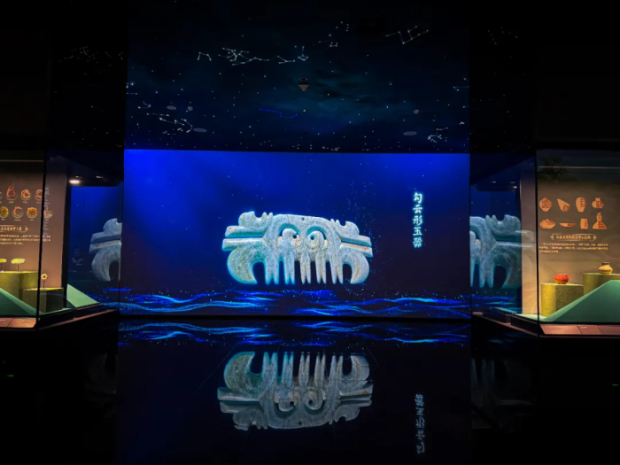 基本陈列序厅,融铸北疆的主题屹立,两翼伸展景泰蓝掐丝传统技艺与内蒙古非遗攒刻技艺融合,与“红山玉龙”“及祥云纹”等32个文化符号的代表有机融合,通过心智数字加工成形,在光影渲染下形成典雅丰饶的历史全景。