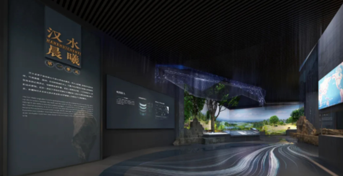 ▲以汉水形态、走向特征为参考,通过多媒体方式在展厅第一部分和第六部分的地面营造汉水意象的光带,凸显汉江这一襄阳重点水文元素。
