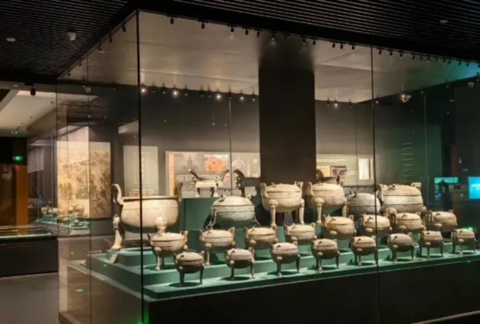 ▲展厅空间中心设计大尺寸文物展柜,以“大司马”鼎为中心,与该墓出土的系列青铜器进行全景式、层级式、矩阵式呈现,让观众在欣赏青铜文物的同时,深刻认识夏商周时期襄阳地区先进的社会发展水平。