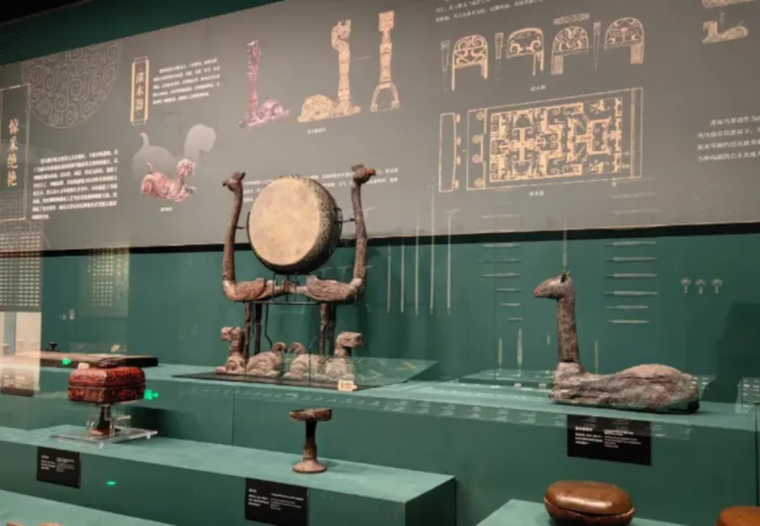▲设计顶天立地式、大纵深的大型展柜装置,实现对楚国时期相关漆器文物的层次式呈现,展柜中辅以图文介绍,打造形成文物视窗。