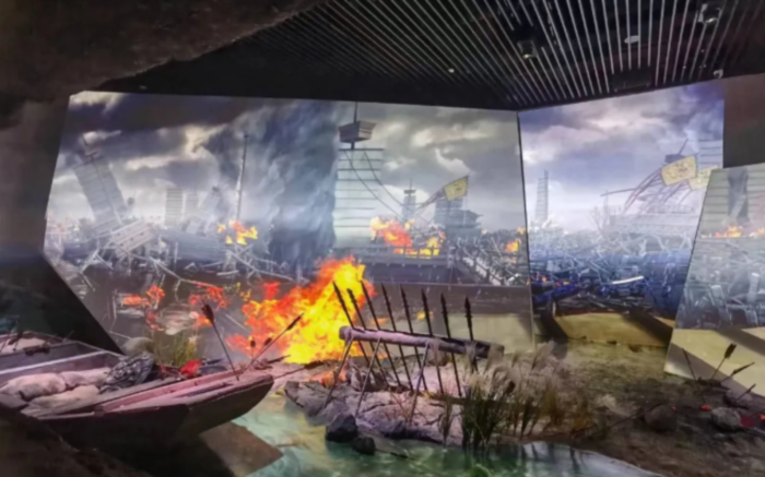 ▲宋蒙襄阳之战沉浸式空间,突破展厅中常见的沉浸式手段,将襄樊二城的地理关系进行解构表现,利用裸眼3D等技术,通过数字影片结合灯光音效场景等手段,打造独属于襄阳的古代战争画面。