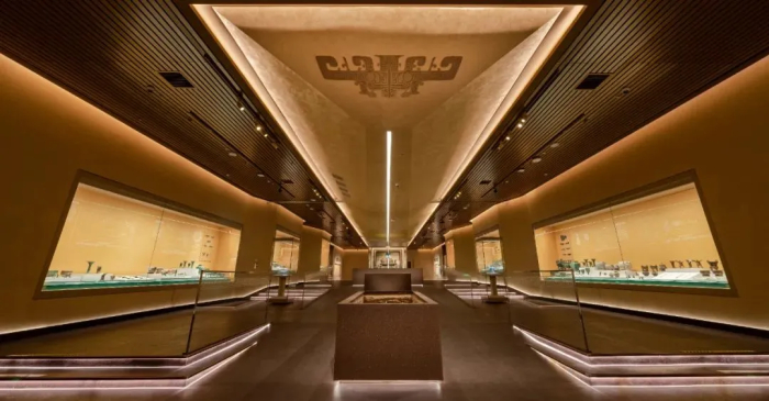 秉承“文脉赓续 汇聚向心”创新理念,提取商文明代表性、典型性、辨识性元素与符号,如文物器型、文字字形、人物造型、遗址特型等,结合灯光、造型、色彩、多媒体等多维方式进行艺术塑造,将展览融入整个场馆空间统一设计,打造专属商文明气质的空间场域。从特色上分析: