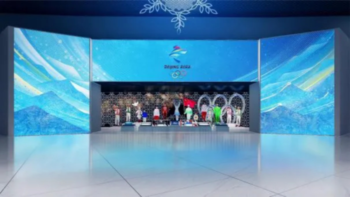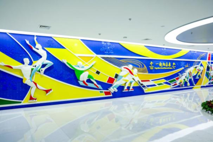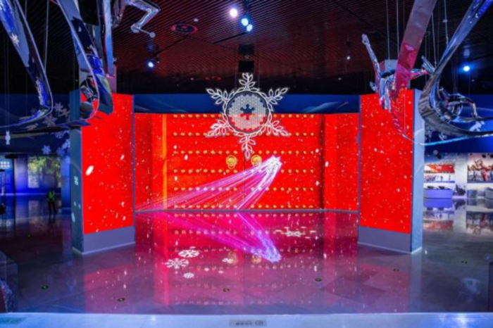 北京奥运博物馆立足展览内容和建筑空间形态,将中华优秀传统文化元素、传统工艺技艺与当代新材料新工艺、现代多媒体技术融合创新,以独有的东方文化叙事、中国式美学与国际化艺术表达,做到传统与现代的融合、中国与世界的融合、陈列与数字的融合,立体诠释超越国界和文化差异的普遍价值。如主题前厅,创新应用不锈钢烤漆、不锈钢镀金镀银、亚克力等中华传统工艺美术技艺和LED灯、透光网孔板等现代新技术、新材料,以极具中国审美的红色、金色、蓝色、银色为主色,融入国际化的奥运五环颜色,打造当代艺术巨幅浮雕壁画,生动呈现奥林匹克这一国际化运动题材,同时,设计空间顶部五环造型灯带,形成中西方元素合璧的艺术空间。在冬奥开闭幕式展区,吸收北京冬奥会、冬残奥会开闭幕式表演的“中国式浪漫”,通过可滑动多幕结构的LED阵列,配合数字艺术、灯光展演等,对接国际审美,向国内外观众再现深厚中华文化的当代阐释,屏幕后围合空间以中国结造型“雪花幕”为主要元素,营造和传递人类命运共同体这一普世性理念,实现全球价值共情。这些都是中国式设计、国际化表达的生动见证。