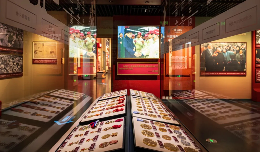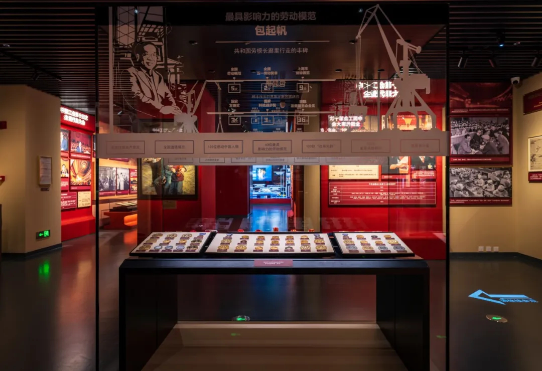 二是智造实践——硬科技激活文化表达粒子。天图集团从新质材料、数字加工设备、文保技术等多专业,融合创新,研制各项指标都满足新时代发展需求和博物馆高标准的先进装备。在展示“抓斗大王”包起帆荣获的74枚荣誉奖章时,应用了集团荣获70余项专利和软著的新型展柜,实现劳模精神与当代制作工艺的匠心基因互文。